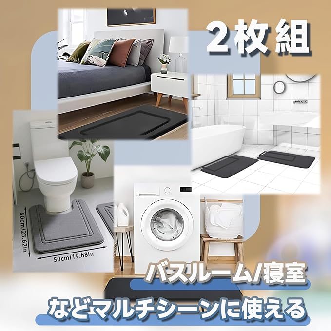 吸水力抜群のバスルームマットセット:セットには「U 型」のトイレマットと「長方形」の足マット(あしふきマット)が含まれ。お風呂上りに足拭きすると、水分を素早く吸収し、浴室をサラサラに保ちます。