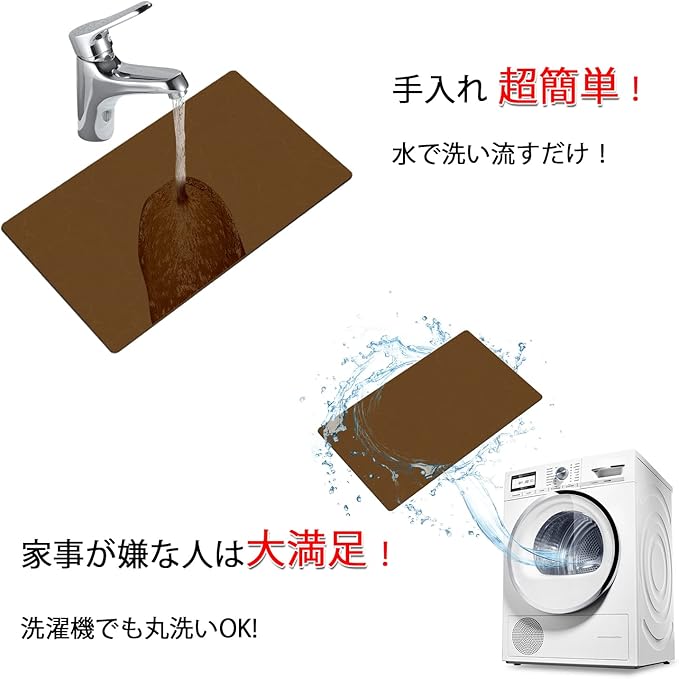 【水洗いと洗濯機で丸洗い対応】 バスマットの表面が汚れたら、水で洗い流すだけで十分です。干す場合は、陰干しがおすすめです。面倒を感じる時に、洗濯機を使用して丸洗いも可能で、吊るして乾かしたりすることができます。
