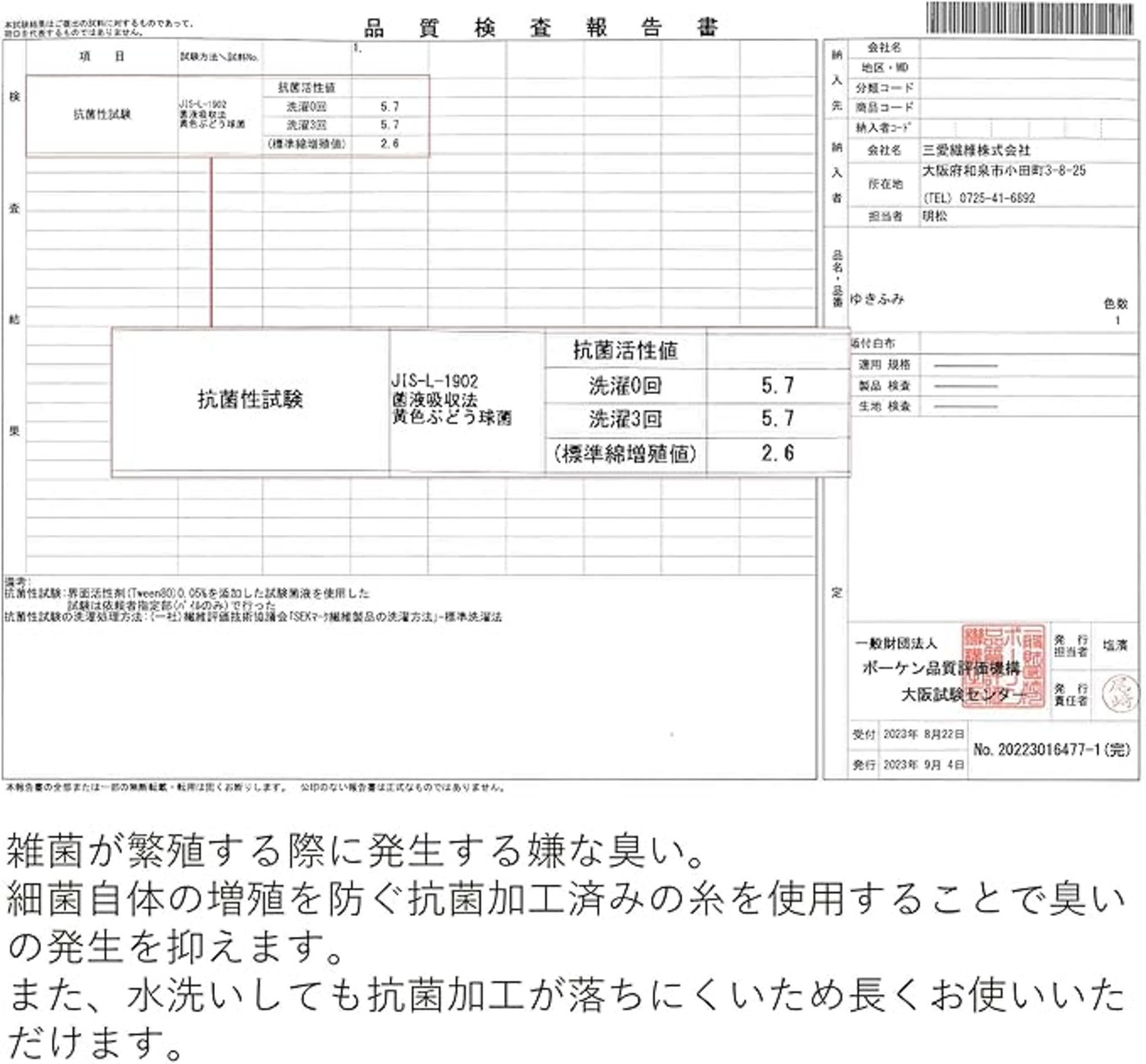 【抗菌・防臭加工済】雑菌が繁殖する際に発生する嫌な臭い。細菌自体の増殖を防ぐ抗菌加工済みの糸を使用することで臭いの発生を抑えます。また水洗いしても抗菌加工が落ちにくいため長くお使いいただけます。