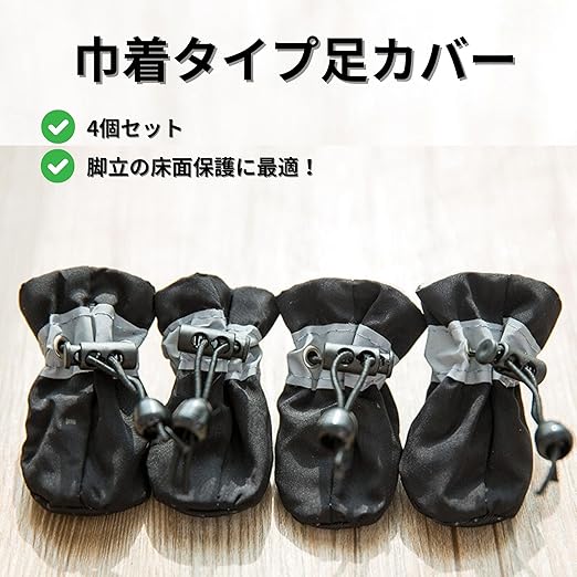 (脚立用足カバー 巾着タイプ)脚立にぴったりフィットする巾着タイプの足カバーです。底部には滑り止めが付いており、床を傷つけずしっかりと保護します。異なるサイズの脚に対応できるため、どんな脚立にもフィットしやすい設計です。4個入りで、脚立1台分に対応しています。