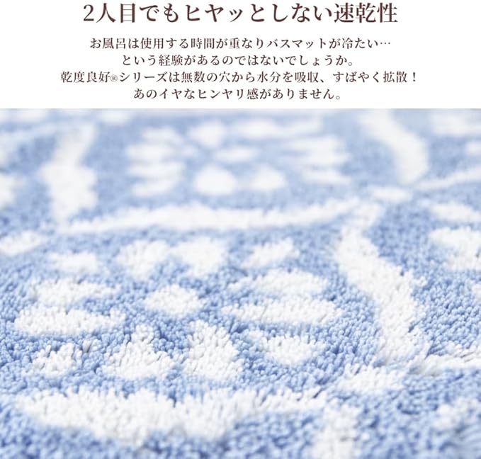 乾度良好バスマットシリーズから女性に人気の高いエレガントな雰囲気の「ボーテ」が誕生。 足元から華麗で優美な演出を楽しむことができます。 乾度良好バスマットの繊維は、特別な加工を施した繊維を使用。繊維には無数の穴があいているのでこの穴にすばやく水分が吸収されます。 だから足を乗せた瞬間に水分を吸収、濡れた感覚がほとんどありません。 乾度良好シリーズは無数の穴から水分だけではなく空気も取り込みすばやく拡散、あのイヤなヒンヤリ感がありません。