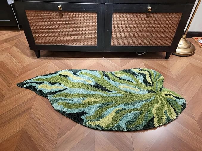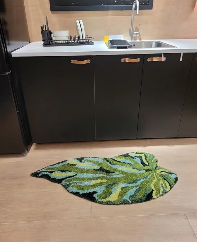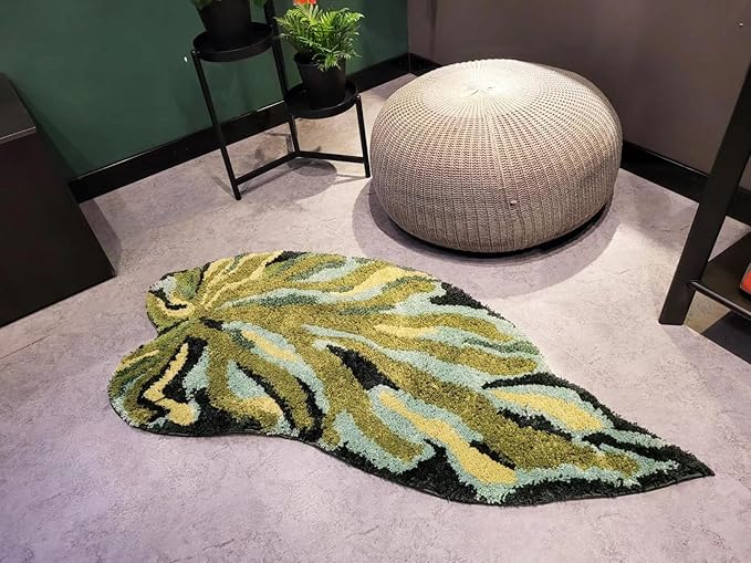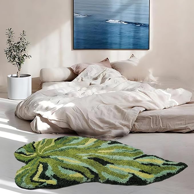 モンステラ葉形マット:葉形デザインが、あなたのお部屋を明るく、ほんわかとした雰囲気にしてくれます。子供部屋やリビングルームなど、どんな場所でも素敵に映えます。