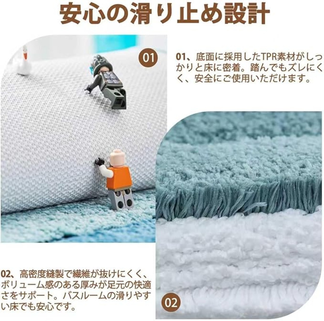 【安心の滑り止め設計】底面に採用したTPR素材がしっかりと床に密着。踏んでもズレにくく、安全にご使用いただけます。高密度縫製で繊維が抜けにくく、ボリューム感のある厚みが足元の快適さをサポート。バスルームの滑りやすい床でも安心です。