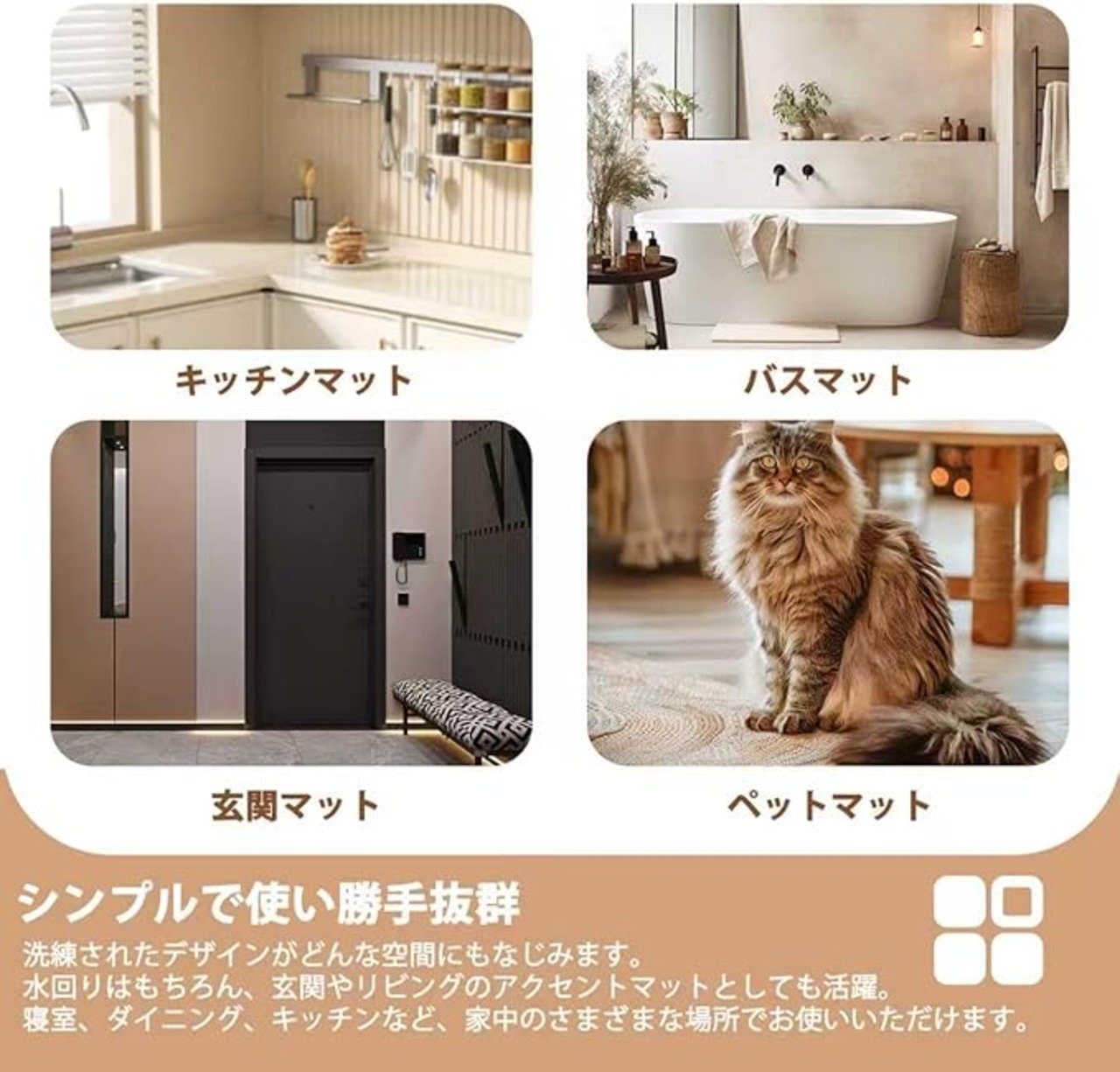 【シンプルで使い勝手抜群】洗練されたデザインがどんな空間にもなじみます。水回りはもちろん、玄関やリビングのアクセントマットとしても活躍。寝室、ダイニング、キッチンなど、家中のさまざまな場所でお使いいただけます。
