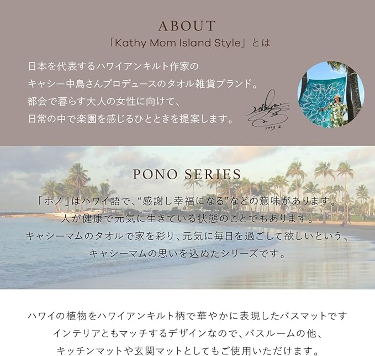 【ポノシリーズ】 「ポノ」はハワイ語で、“感謝し幸福になる”などの意味があります。人が健康で元気に生きている状態のことでもあります。キャシーマムのタオルで家を彩り、元気に毎日を過ごして欲しいという、キャシーマムの思いを込めたシリーズです。