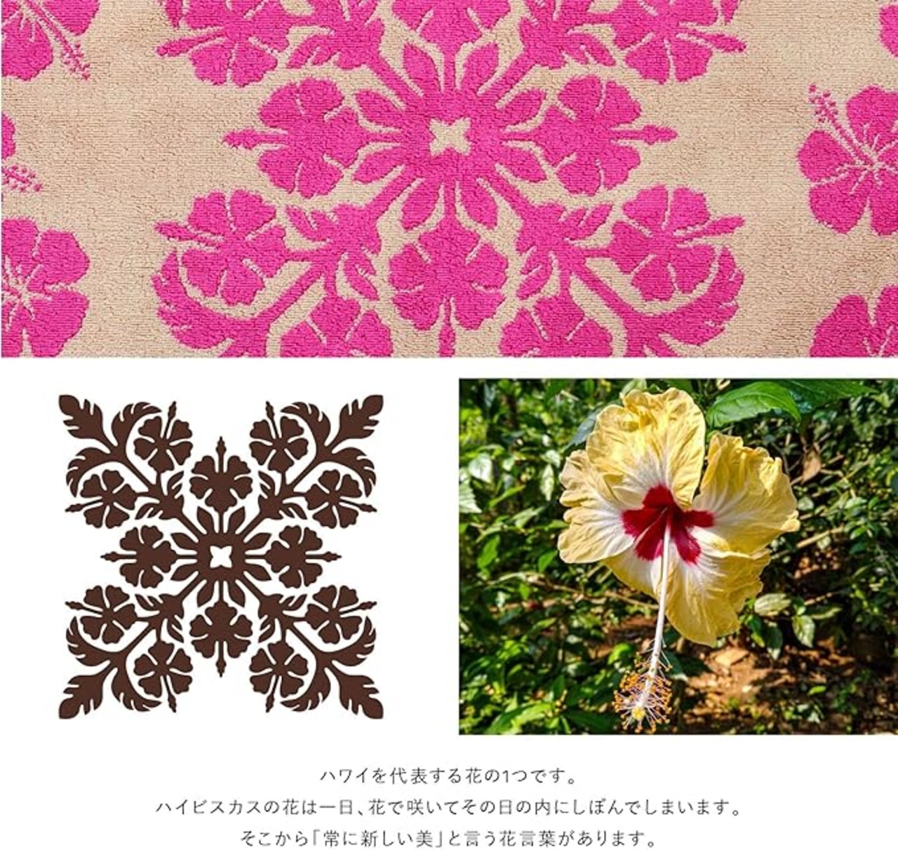 【モチーフについて】ハイビスカス:「ハイビスカス」は、ハワイを代表する花の1つです。ハイビスカスの花は一日、花で咲いてその日の内にしぼんでしまいます。そこから「常に新しい美」と言う花言葉があります。