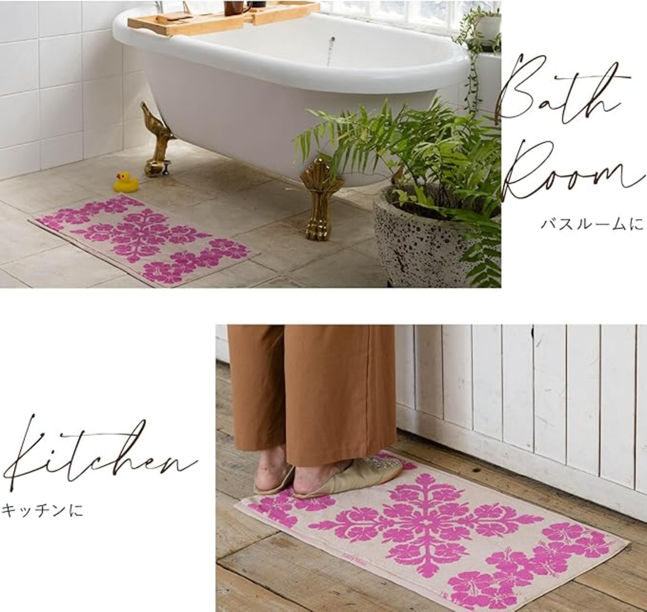 【KathyMamIslandStyle(キャシーマムアイランドスタイル)のタオルバスマット】 ハワイで愛されている花や植物をデザインした、リゾート感あふれるバスマットです。しっかりとした厚手のパイル地を使用しているので、シワにならずにすっきりと敷くことができます。 裏側には滑り止めがついているので、安心してお使いいただけます。インテリアともマッチするデザインなので、バスルームの他、キッチンマットや玄関マットとしてもご使用いただけます。