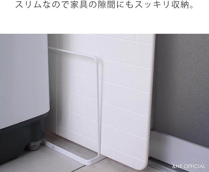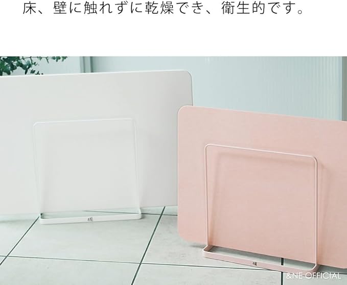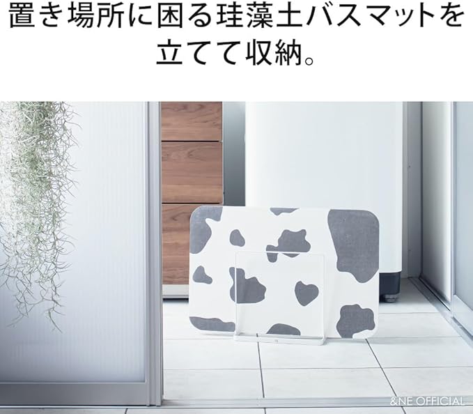 敷きっぱなし、不安定な立てかけを防ぐ、珪藻土バスマット専用の収納スタンドです。床、壁に触れずに乾燥でき、衛生的です。スリムなので家具の隙間にもスッキリ収納。