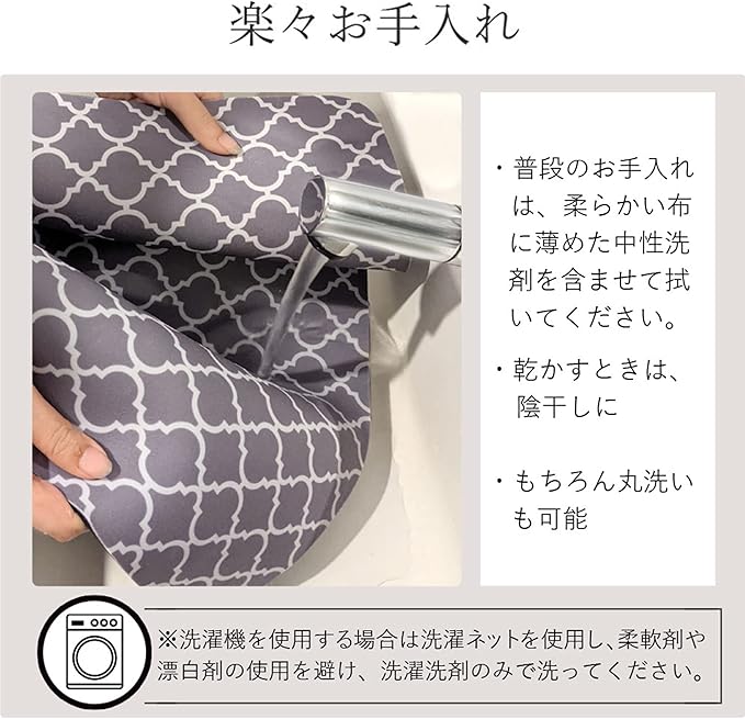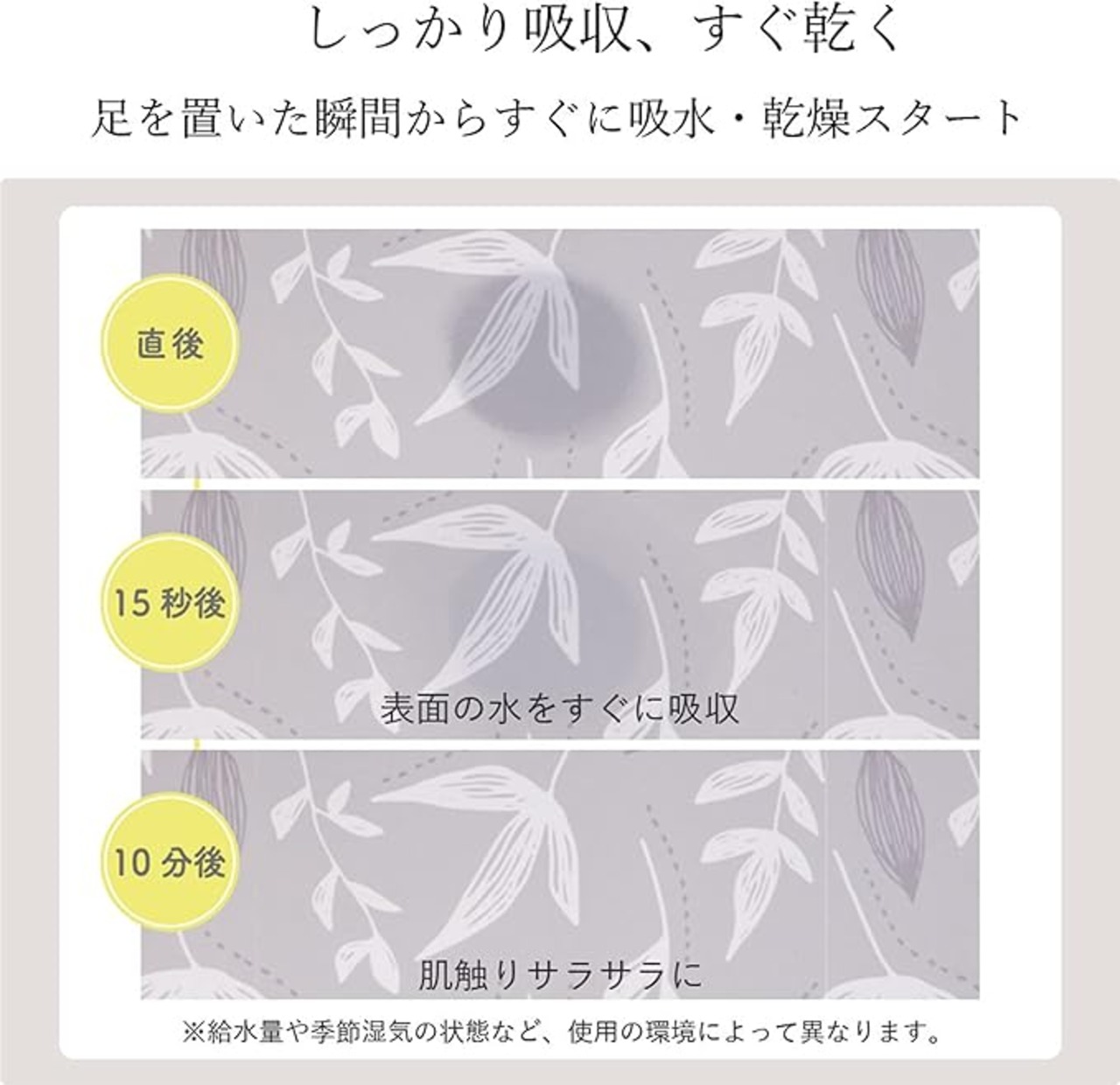 【備考】本来の用途以外では使用しないでください。 直接水やお湯のかかる場所や浴室内に持ち込んで使用しないください。 色のついた水分を吸収した場合はシミとして残る可能性がございます。 使用後はよく乾燥させてください。ゴム製品の為乾燥させる場合は陰干しを行ってください。 天日干し、暖房機、乾燥機では乾かさないでください。 開封後に珪藻土や天然ゴムの独特な臭いがすることがございますが、徐々に薄れていくので問題ございません。 バスマットを置く位置は定期的に変更してください。長時間敷いた場合、色落ちや変色する場合がございますので、ご注意ください。