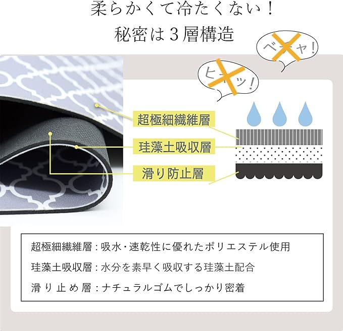 ✅【2023年最新版】今までの硬い珪藻土バスマットから進化しました!硬い珪藻土マットで多かった困りごと、硬くて畳めないため収納に困る。冬だと冷たい。割れてしまう。 吸水力が落ちたらヤスリで削ってメンテナンス等の困ったを【monet fav珪藻土ソフトバスマット】は解決しました。 やわらか素材だから足をおくとソフトで適度な柔軟性の踏み心地なので、長時間立ちっぱなしのキッチンマットとしても、また吸水性に速乾性に優れているため洗った食器を置く吸水マット、玄関マットとしてもお使いいただけます。 おススメです。裏はナチュラルゴムでしっかり滑り止め加工。ハサミで自分の理想の大きさに切ることもできます。 ペットマットとして、小さなお子様のお食事マットとして等使い方は色々。