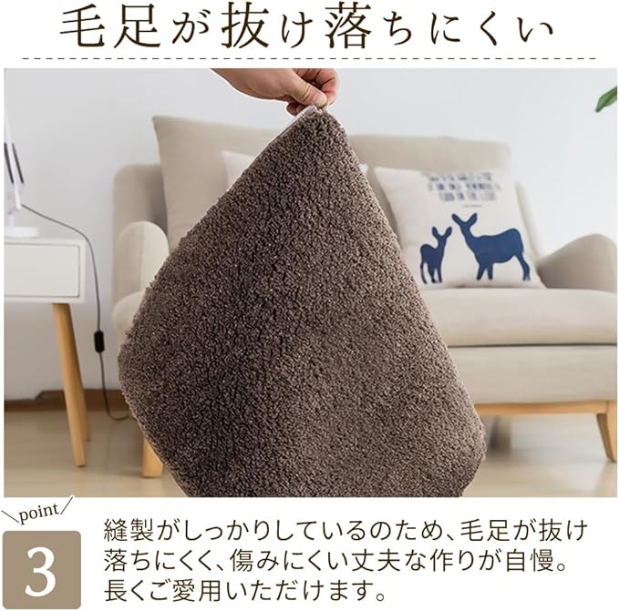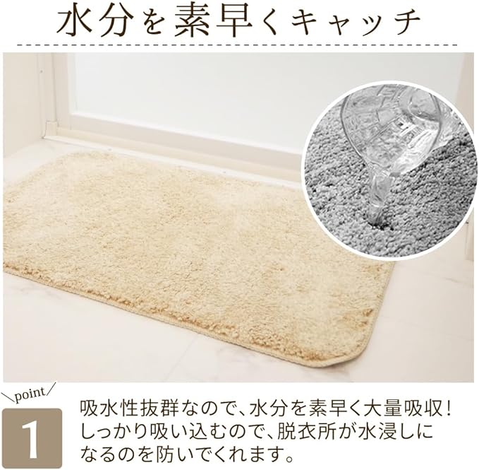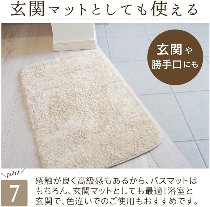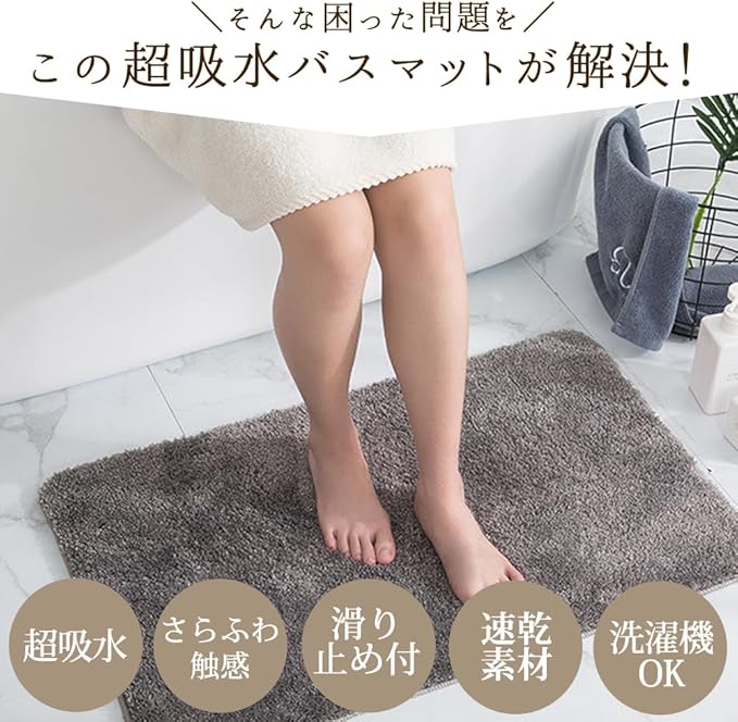 【ふわふわ肌触り】バスマットの表地はマイクロファイバー素材を使用、柔らかな肌触り、濃密な長毛が足を包み込むような踏み心地、雲の上を歩くような質感で、足を柔らかくサポートします。 【優れた吸収性】毛足が長く水分に接する面積が多いので、吸水力が抜群です。瞬間的にお風呂上がりの水分を吸収することができます。速乾性にすぐれているので、短時間で複数回使用してもラサラの使い心地です。 【滑り止め付き】裏面に滑り止めを施し、ズレや転倒を防止し、バスルームなど湿気や水気の多い場所でもご年配の方やお子様などの転倒防止や安全面もしっかりお守りします。また地面にフィットし、耐摩耗性材料を使用している為、水が滑り止め部分まで浸透することはなく床に対してもノンダメージでご使用頂けます。 【速乾 洗える】洗濯機を使用して丸洗い可能です。洗っても色褪せにくく、脱ガム材・非直結式・変色・変形はございません。洗い替え用で複数使いもおすすめです。