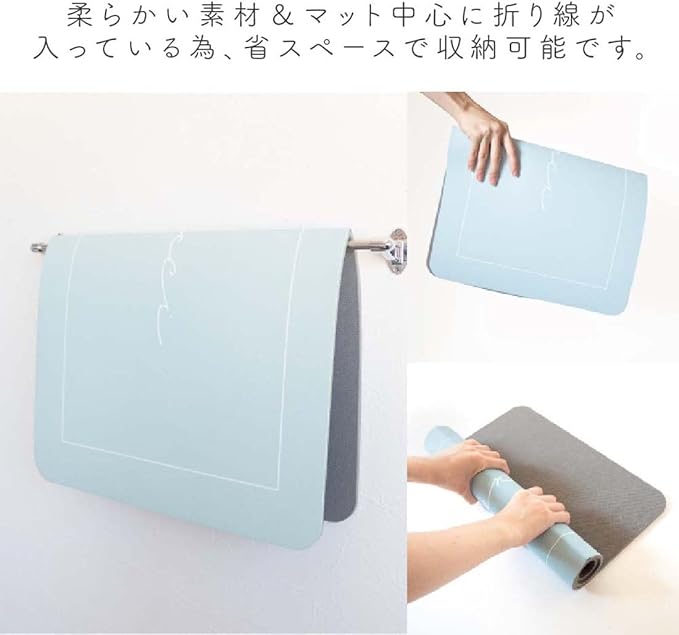 マット中心にある折れ線で畳めるので、丸まらず干しやすい仕様です。軽くて柔らかく、畳むor丸めて省スペースに収納可能です。