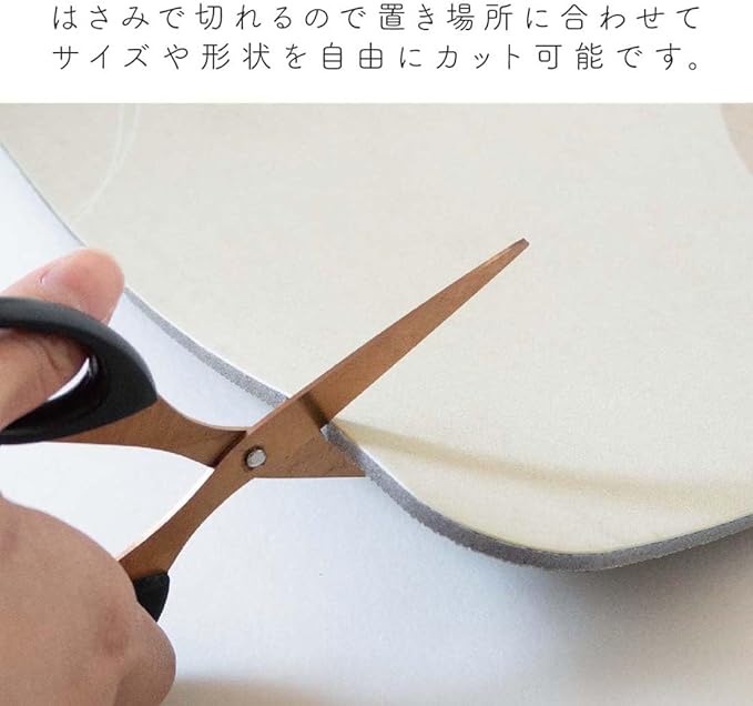 珪藻土製と違い、足元がヒヤッとしたり割れる心配もないので快適にご使用頂けます。ハサミで切れるので置き場所に合わせてサイズや形状を自由にカット可能です。