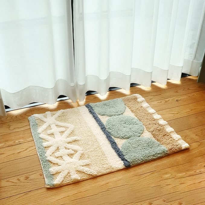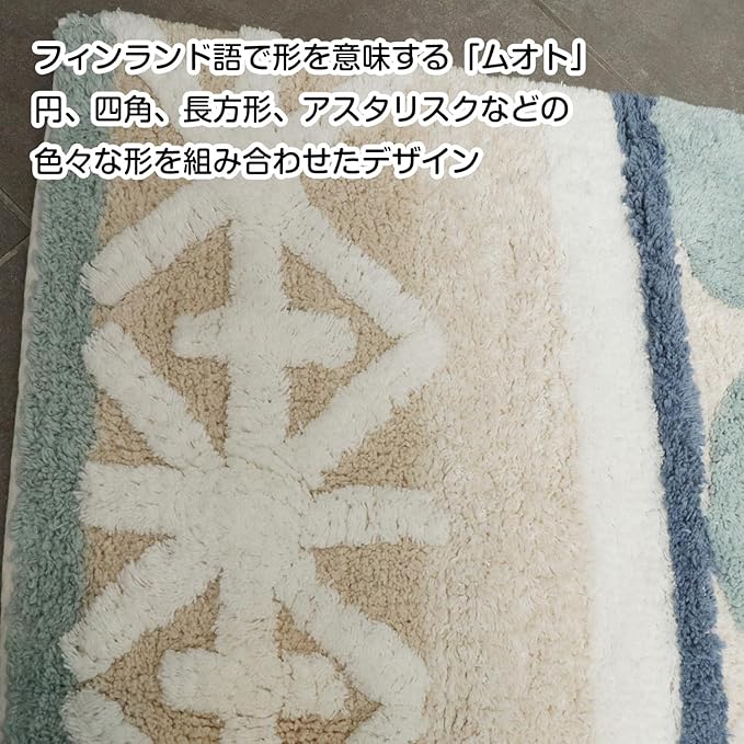 フィンランド語で「形」を意味する「ムオト」。円、四角、長方形、アスタリスクなどの色々な形を組み合わせたデザインと柔らかなパステルカラーが、空間を洗練された雰囲気に変えてくれます。バスマット、玄関マット、インテリアマットなど様々な用途でお使いいただけます。素材はコットン100%で、風水的にも「木」の気を持つ天然素材の綿は、洗面所や玄関と相性も良いとされています。マットは1600GSM(1平方メーターあたりのグラム数。数値が大きいほど糸の量が多く、高密度で織られているマットの数値)でボリューム感があります。