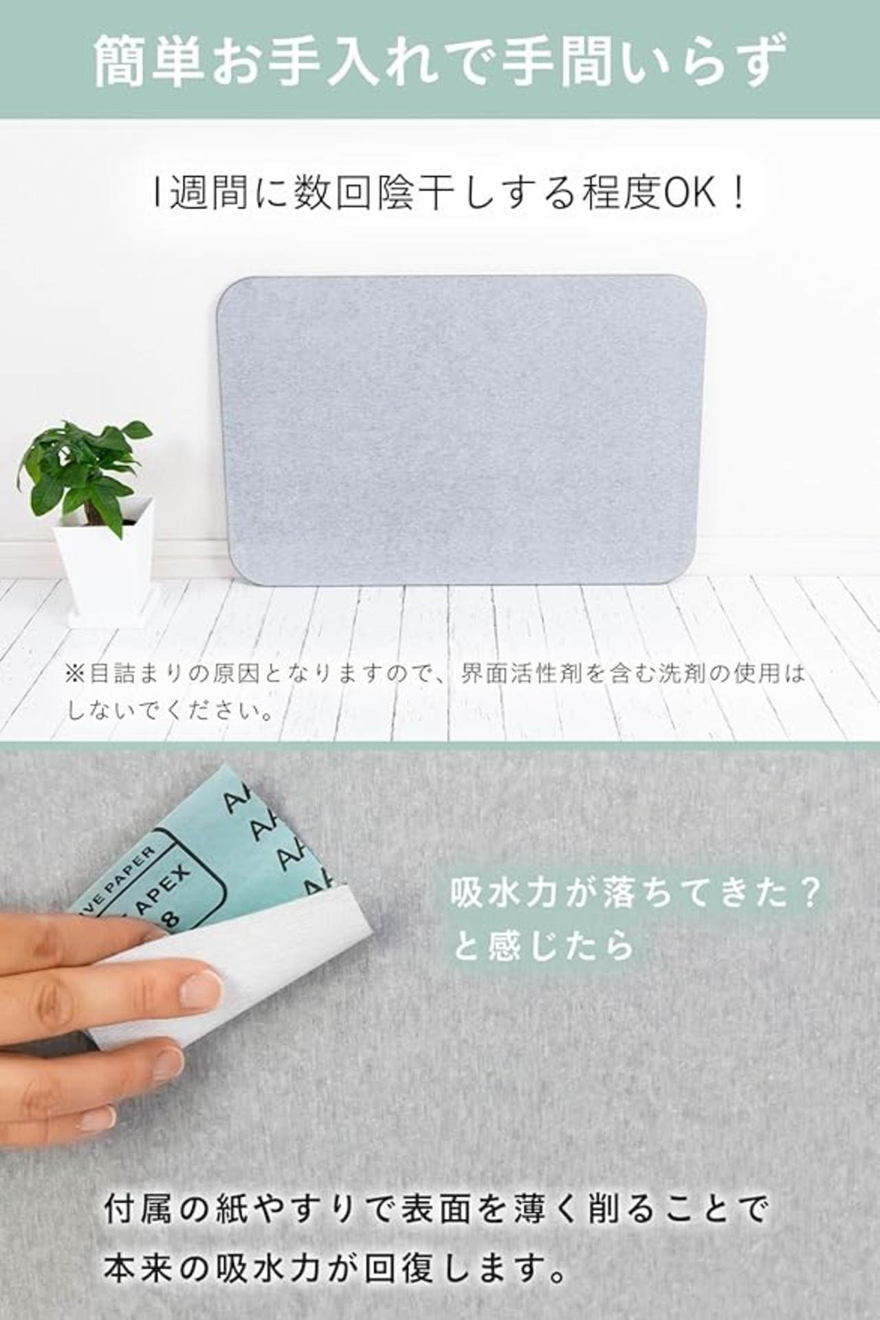 吸水力が落ちてきたと感じたら、付属の紙やすりで表面を薄く削ると吸水力が回復します。MサイズとLサイズをご用意しました。ライフスタイルに合わせてお選び頂けます。製造・梱包時において微量な粉が表面に付着しております。そのまま使用しますと、床や、衣服、お肌に付着する場合がございます。使用まえにタオルなどで、粉を拭き取ってからご使用ください。