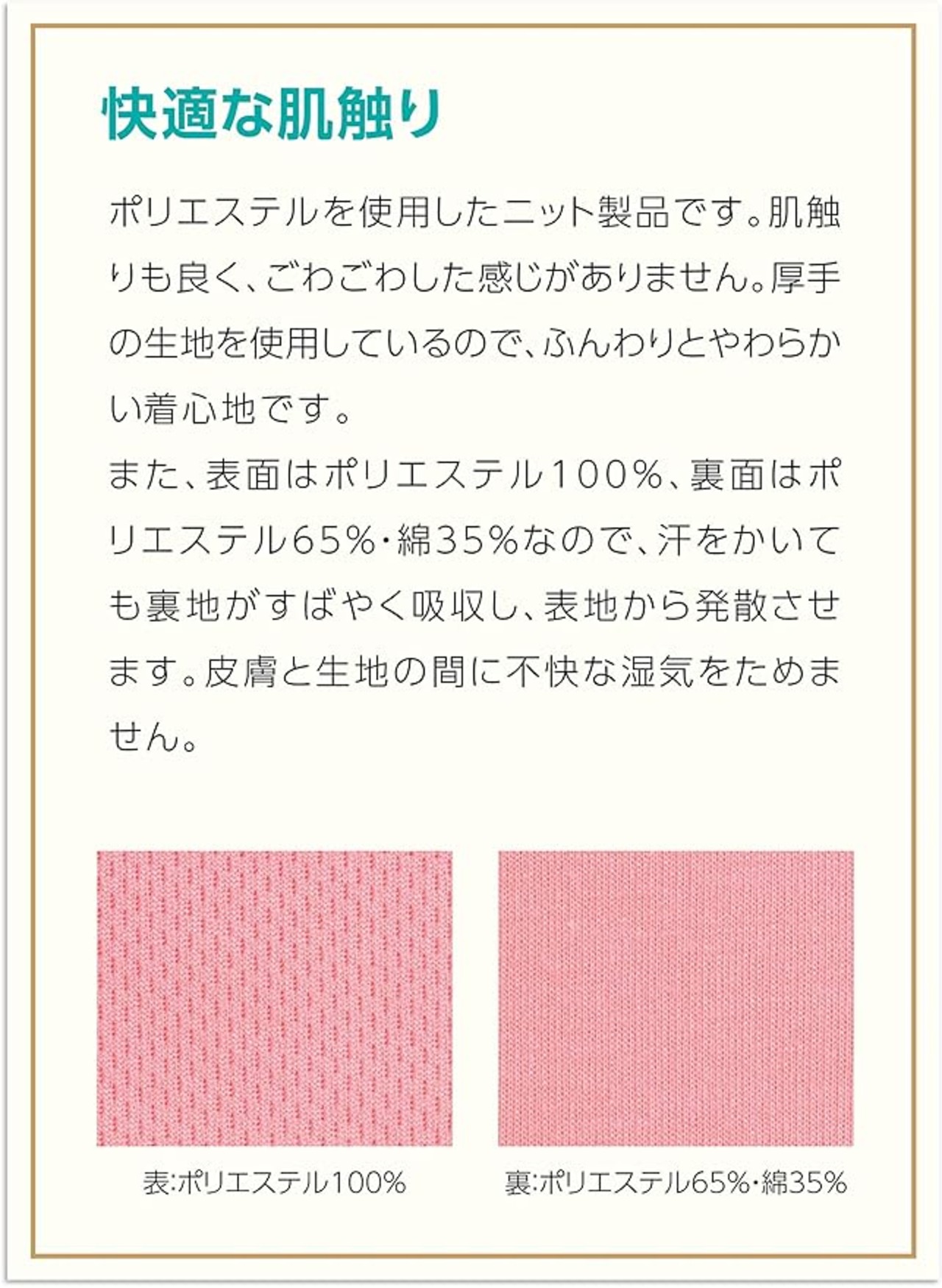 ポリエステルを使用したニット製品です。肌触りが良くゴワゴワした感じがありません。厚手の生地を使用しているのでふんわりとやわらかい着心地で、シワにもなりません。表面はポリエステル100%、裏面は綿が35%入っているので汗をかいても裏地がすばやく吸収し表地から発散させるため、皮膚と生地の間に不快な湿気をためません。