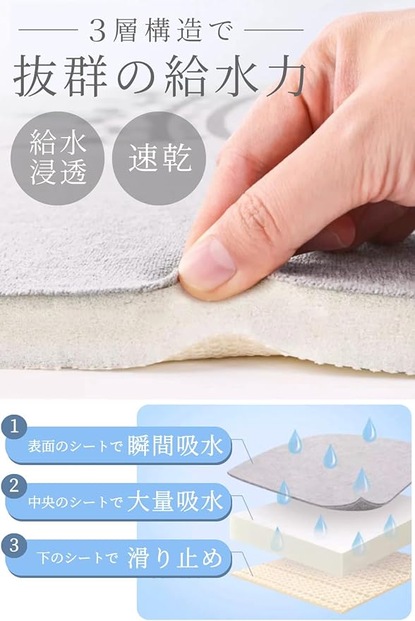 3層構造になっており、表面のシートは瞬間吸水、中央のシートで大量吸水、最下部のシートは滑り止めになっており、お客様の心地のよさを追及した、おしゃれな極厚マットです。