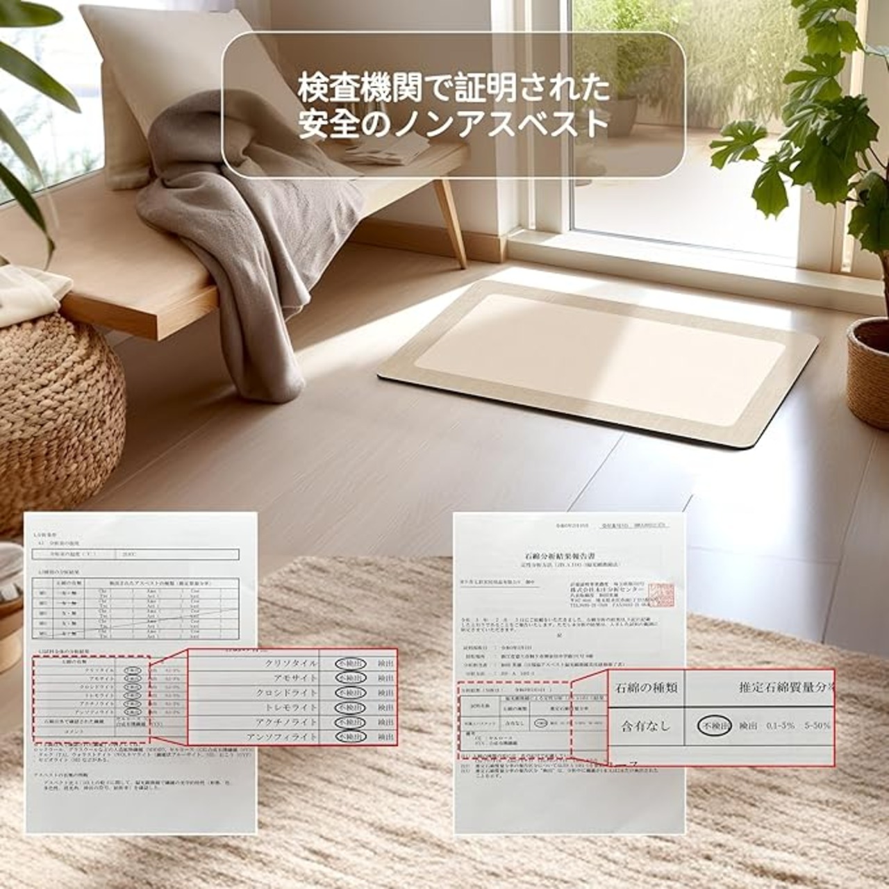 【アスベスト不使用&品質保証】弊社で販売している珪藻土バスマットソフトは、アスベストなどの有害物質は含有されていません。安心してご使用いただけます。当製品は日本国内検査機関にて成分調査を実施しておりますが、アスベストは検出されておらず、高い安全性が証明されています。お届いた商品についてなにか問題がありましたらお気軽にご連絡をお願い致します。商品に何一つ不具合がある場合、お気軽に購入履歴より弊社までご連絡ください。