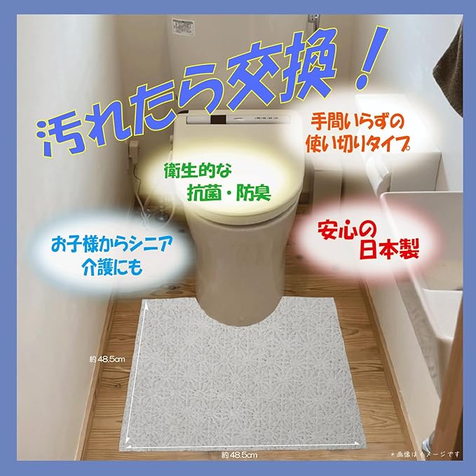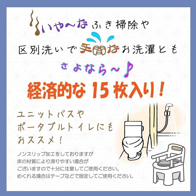汚れたら捨てられるディスポ仕様のトイレマットです。在宅介護や子供のトイレトレーニングのお供に最適です。