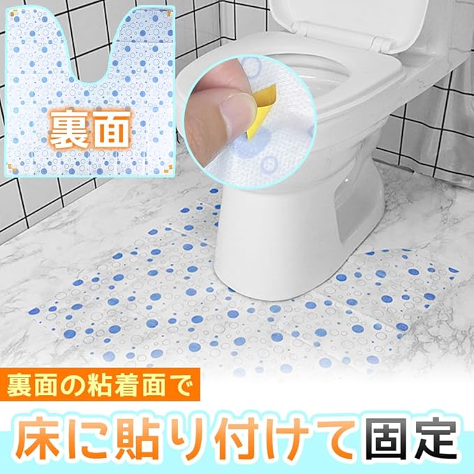 使い方はとても簡単!トイレマットを広げて便器に沿って敷くだけで設置完了です。U字部分は若干細めに設計されていますので、設置環境に合わせてハサミでカットして調整してください。