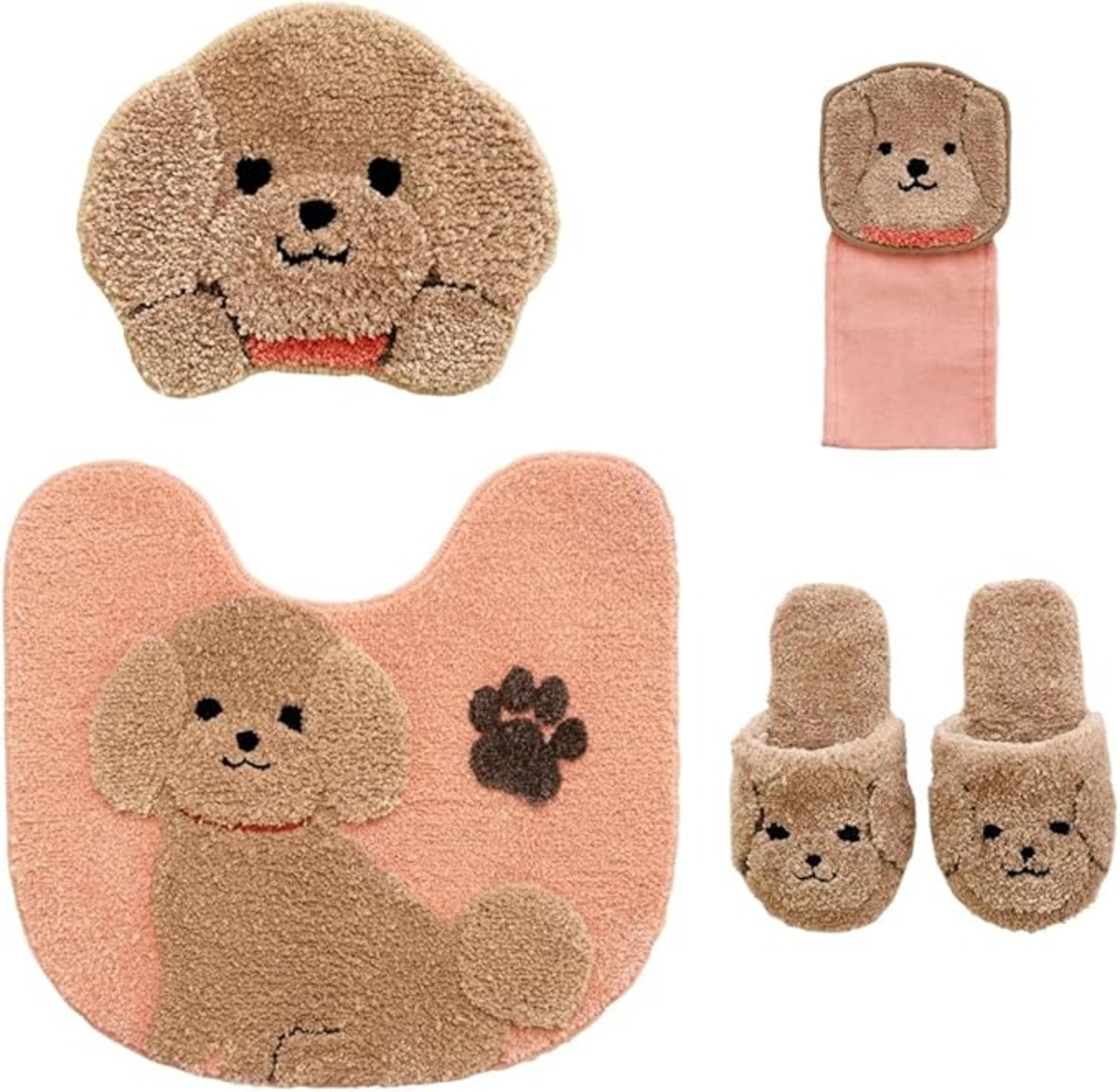 ※セット 1:トイレマット (約55 60cm)2:ふた用デコレーション プードル(27.5cm 24cm) 3:ペーパーホルダーカバー 4:スリッパ