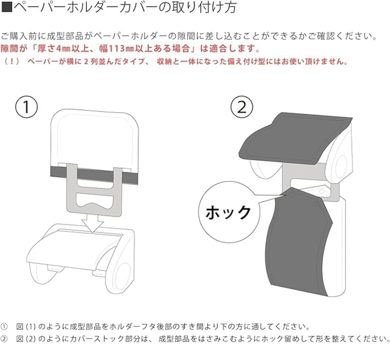 ※当商品は衛生商品ですので、返品をお請けできません。 ※適合します:40~46cm 奥までかかりませんが装着可能です。:47~52cm (フタ長さ+前部厚) ※自動開閉機能付きのトイレでは自動開閉機能はお使いになれません。 ※ペーパーホルダーカバーは、上下連結フックが差し込めないタイプのペーパーホルダーには使えません。