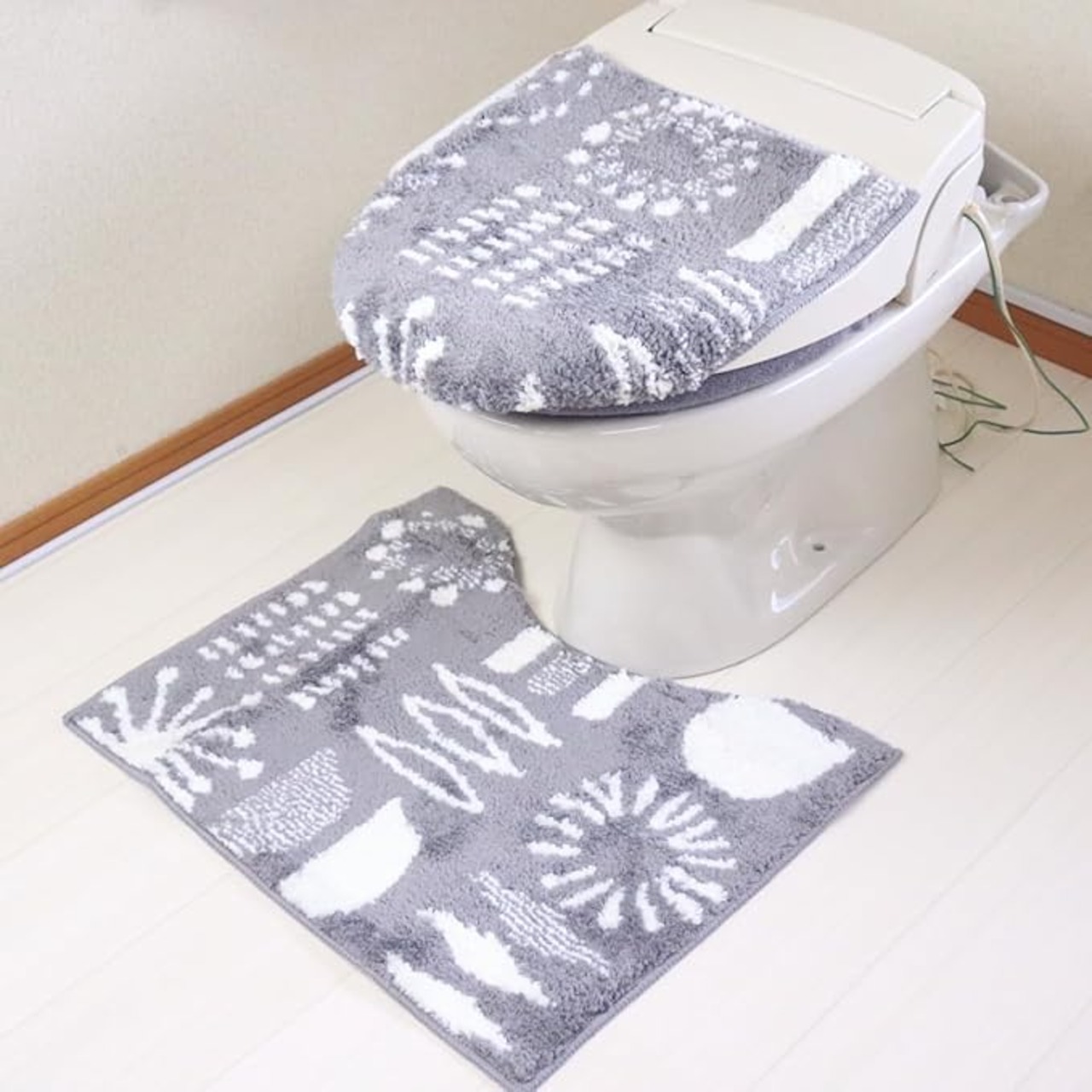 トイレマット、吸着型フタカバー、スリッパ、ペーパーホルダーカバーの4点セットです。