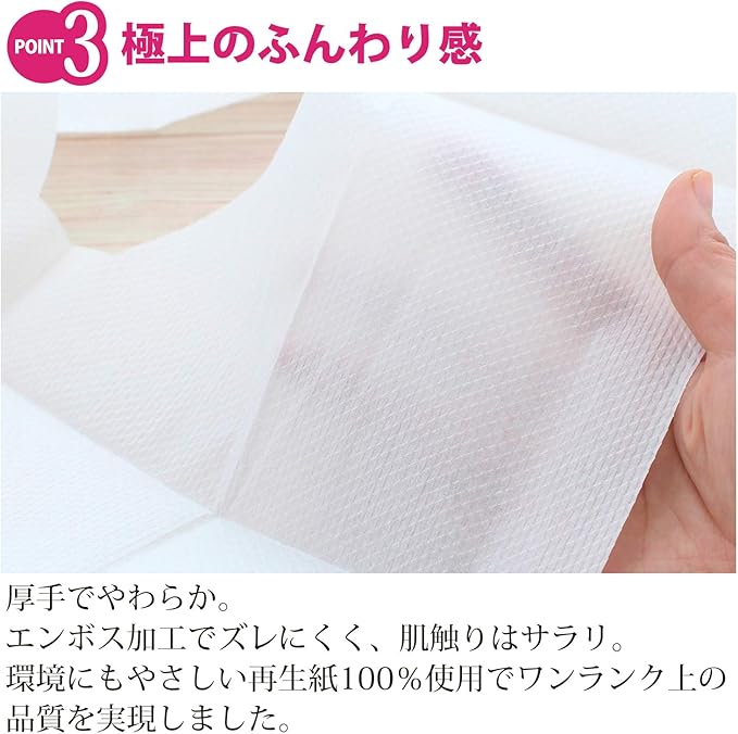 ●エンボス加工でずれにくく、使用後はそのまま水に流せるため使い勝手バツグンです。