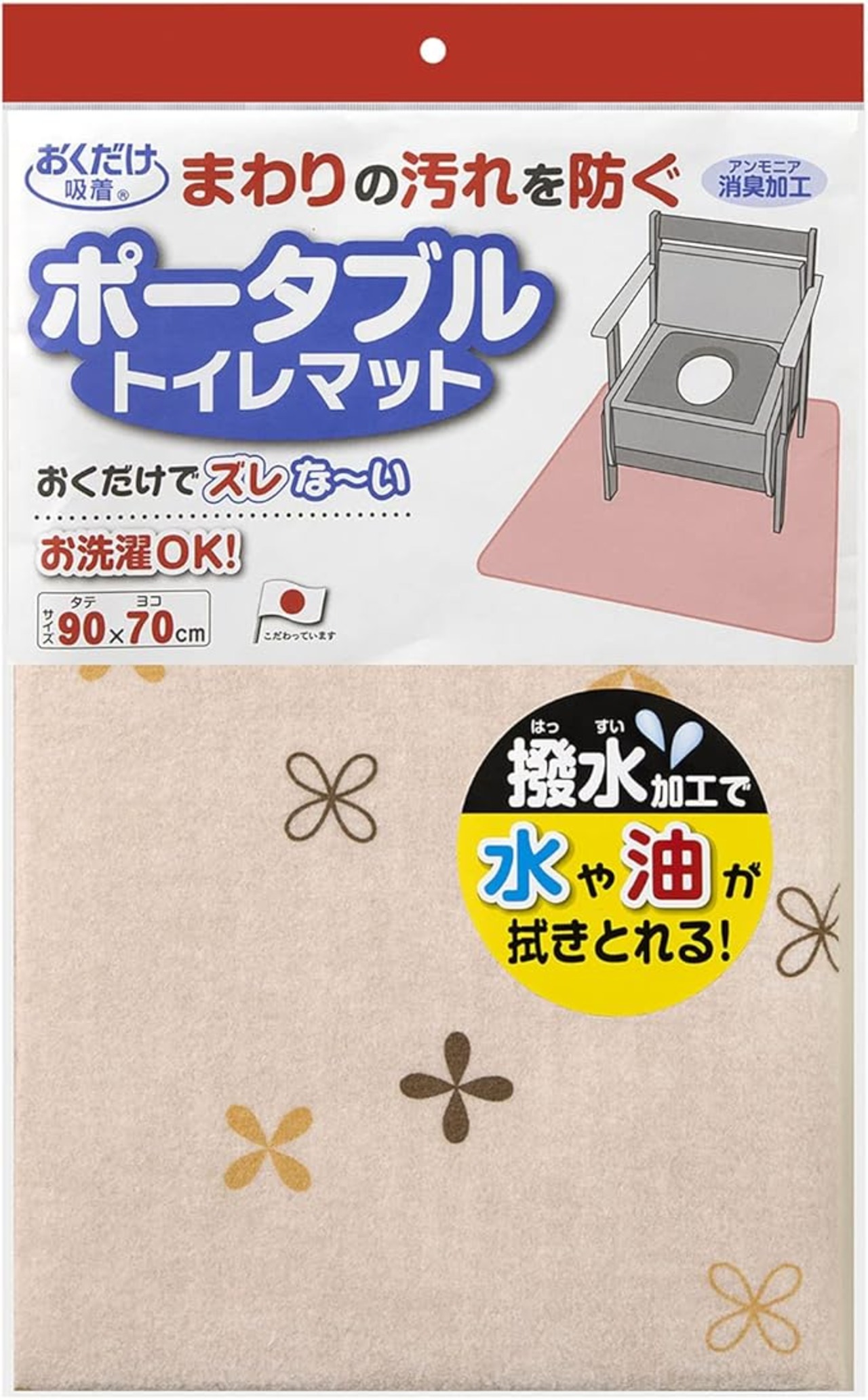 ポータブルトイレ用のマットです。生地は薄手タイプを使用していますので段差がなく、おくだけで吸着する加工を施しているため滑る心配もありません。サイズ90 70cm個装サイズ:40 26 3cm重量235g個装重量:235g素材・材質表面:ポリエステル100%裏面:アクリル樹脂(カテキン入り)生産国日本 おくだけでズレないポータブルトイレマット。------ ココがポイント! ------●汚れても簡単にはがして洗濯機で丸洗いできます。※無垢材などの表面が凹凸した面へは使用できません。GR使用イメージBE使用イメージポータブルトイレ用のマットです。生地は薄手タイプを使用していますので段差がなく、おくだけで吸着する加工を施しているため滑る心配もありません。