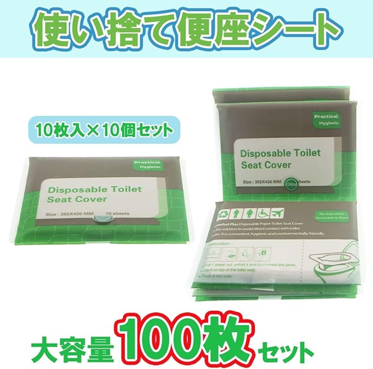 大容量!使い捨てのトイレ便座シート100枚セットです。10枚の携帯シート 10袋となっており、外出時や旅行先に持ち運ぶときにも便利です♪