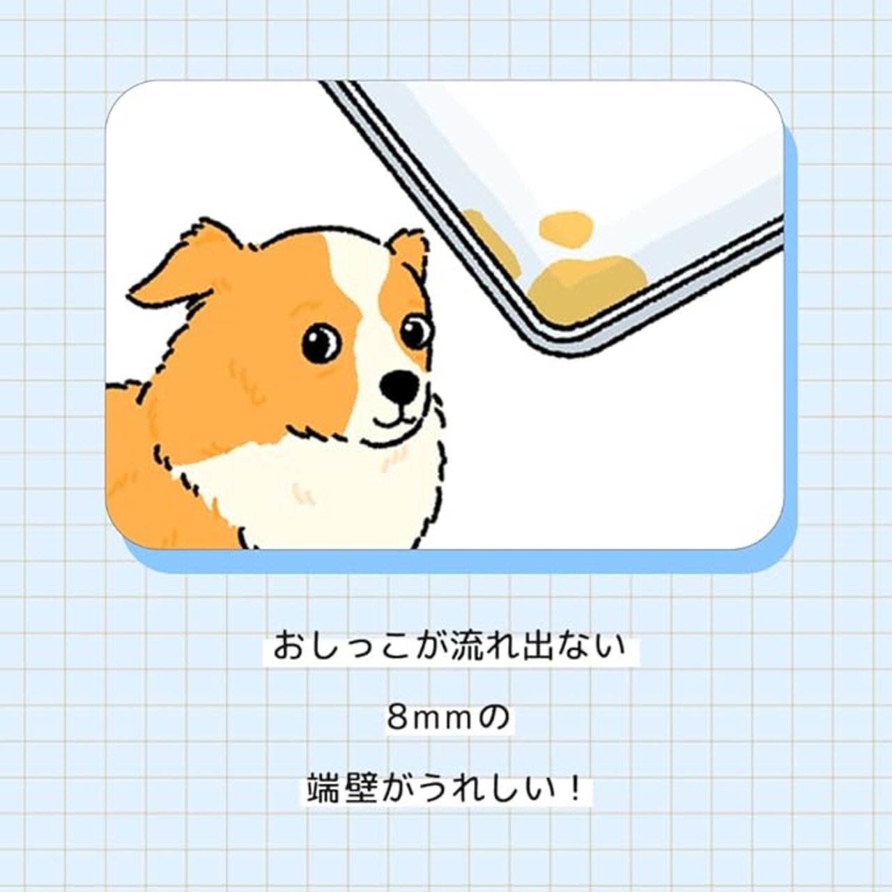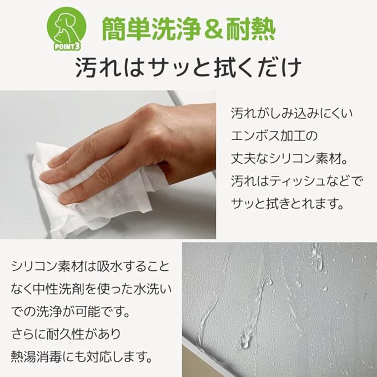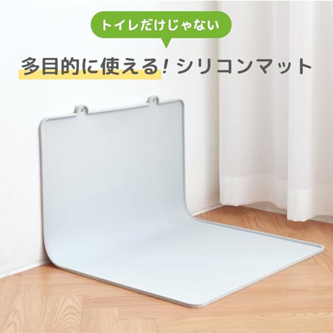 トイレ用・食べこぼし用など色々使えるゆったりサイズ おしっこがこぼれない高い端壁 壁へのマーキング対策に 洗浄が簡単なシリコン素材 滑らないマットで脱臼予防に 噛んでも無害な安心素材
