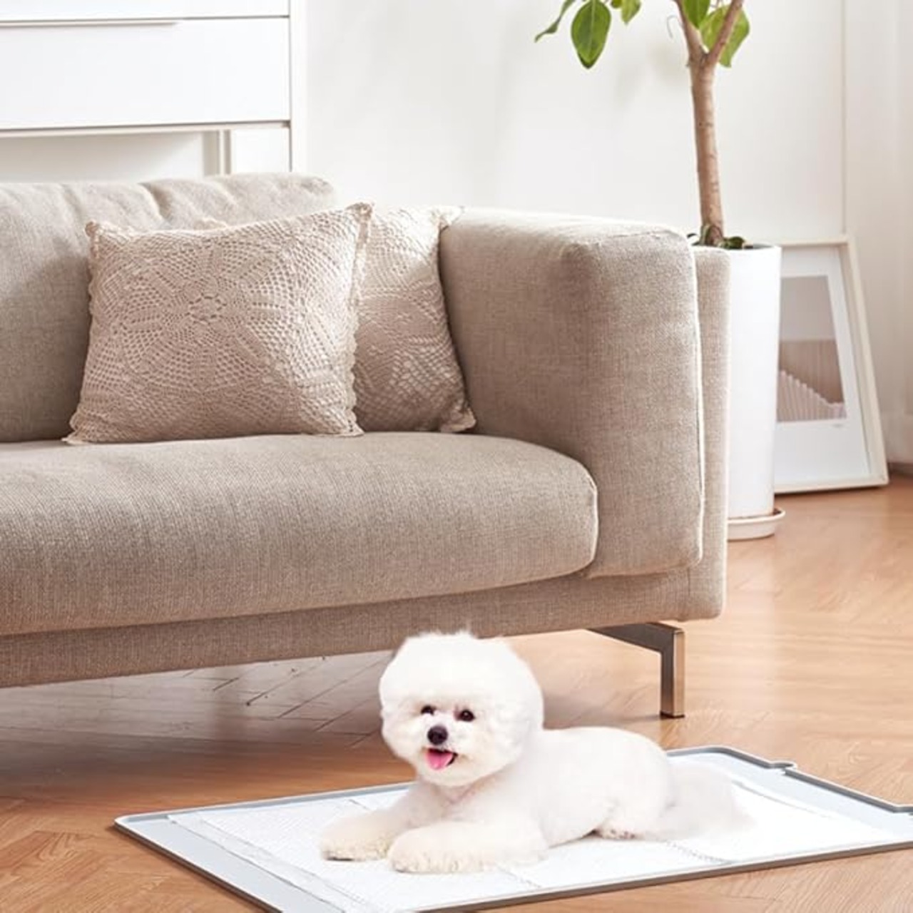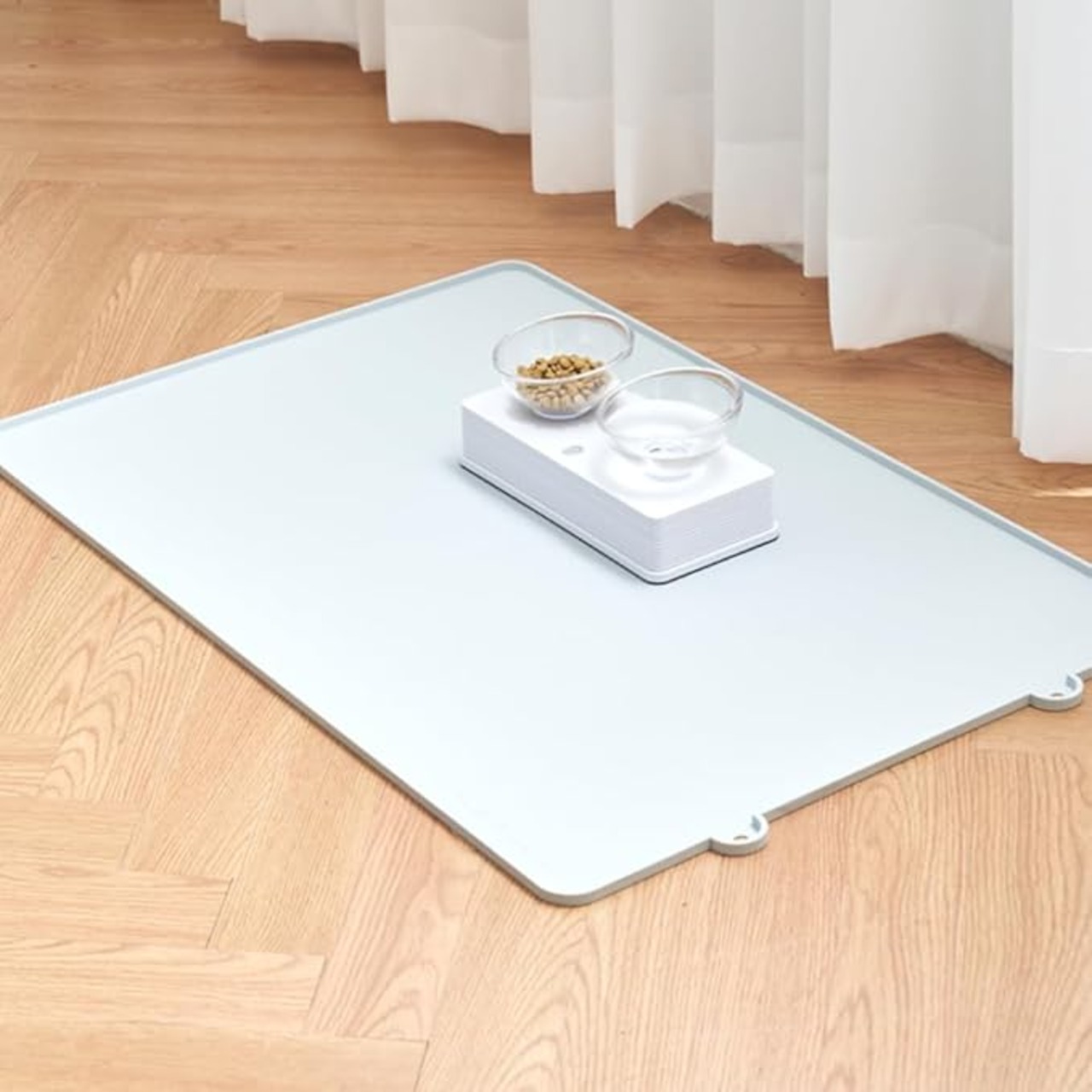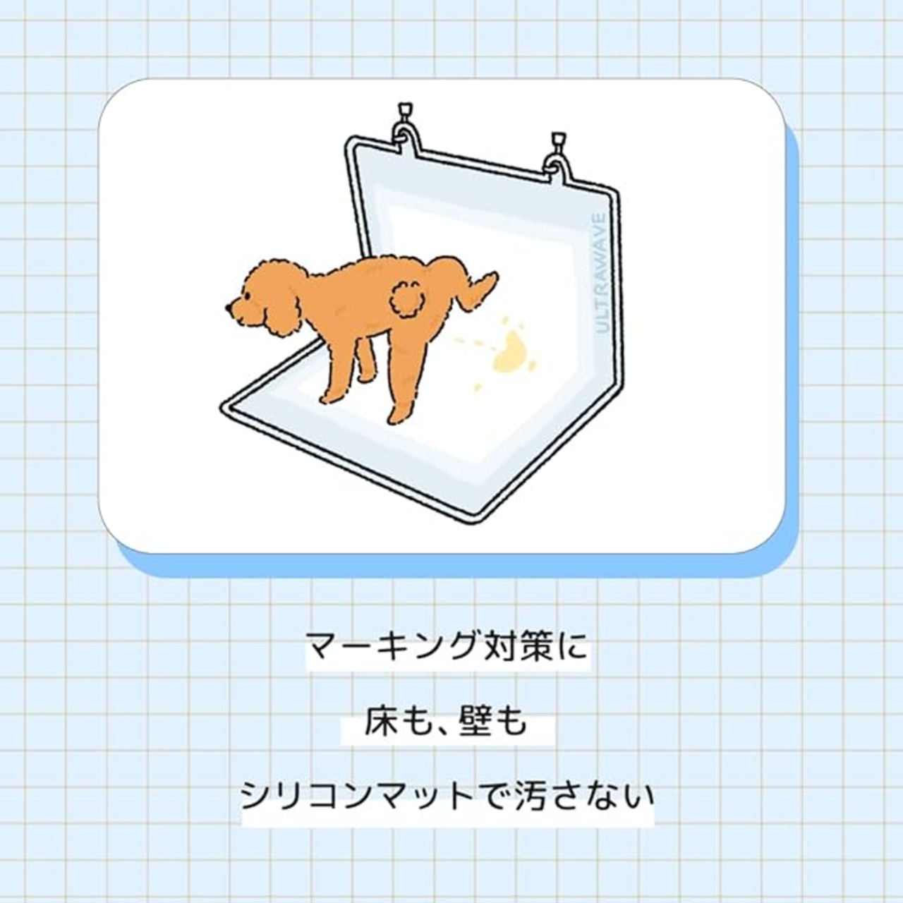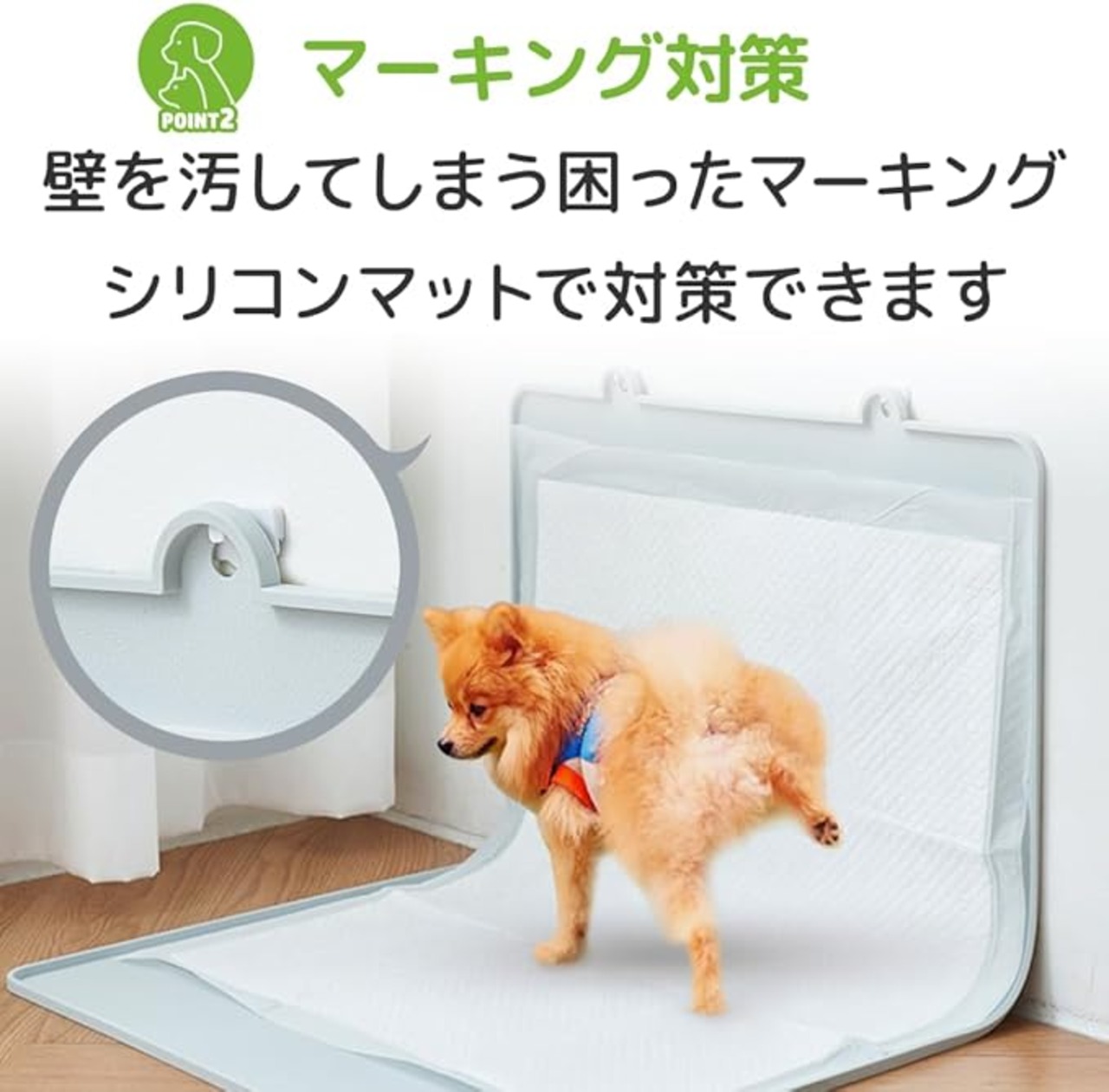 トイレ用・食べこぼし用など色々使えるゆったりサイズ おしっこがこぼれない高い端壁 壁へのマーキング対策に 洗浄が簡単なシリコン素材 滑らないマットで脱臼予防に 噛んでも無害な安心素材
