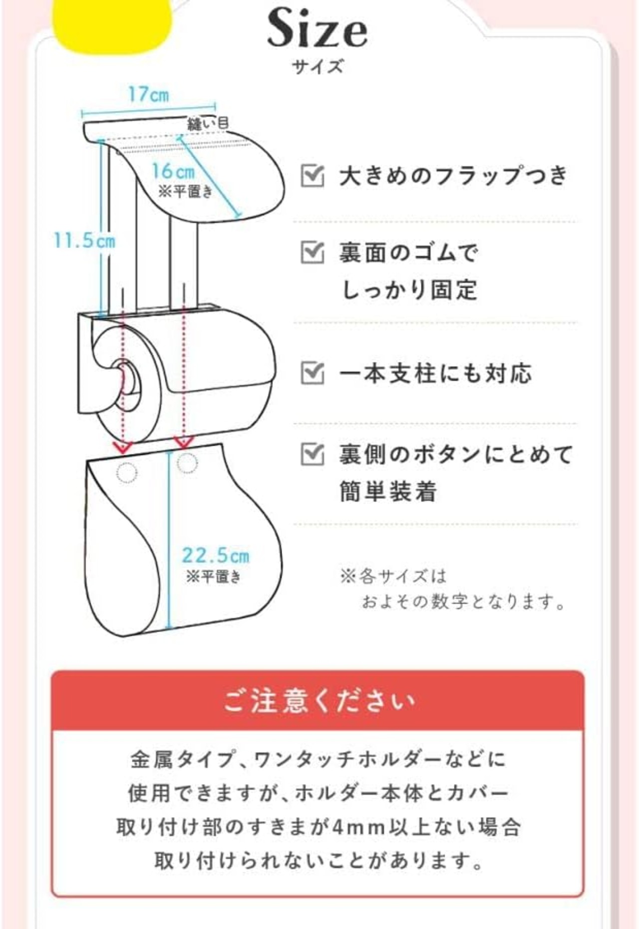 【商品に関するご注意】 ●包装に使用されている部品(留め具、袋など)は、お子様の手の届かないところに処分してください。 ●金属タイプ、ワンタッチホルダーなどに使用できますが、ホルダー本体とカバー取り付け部のすきまが4mm以上ない場合、取り付けられないことがあります。 ●トイレットペーパーホルダーカバー以外の用途には使用しないでください。