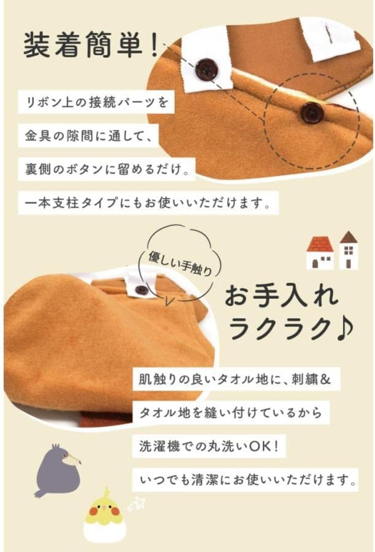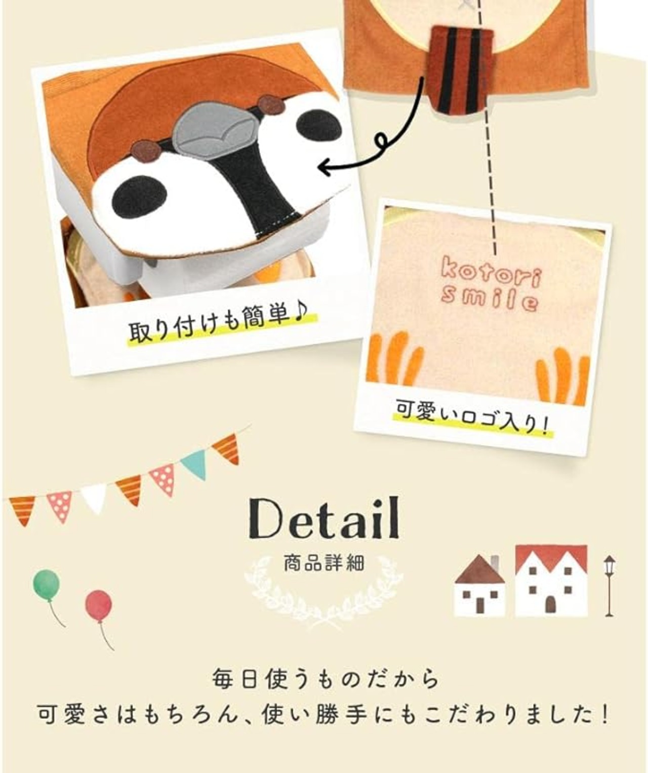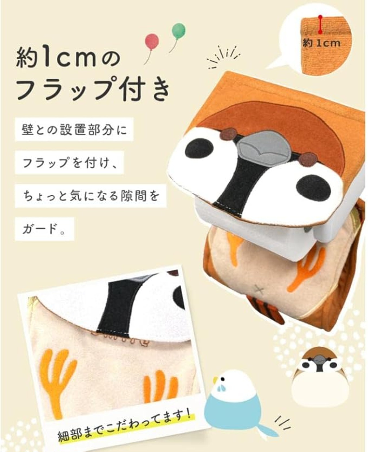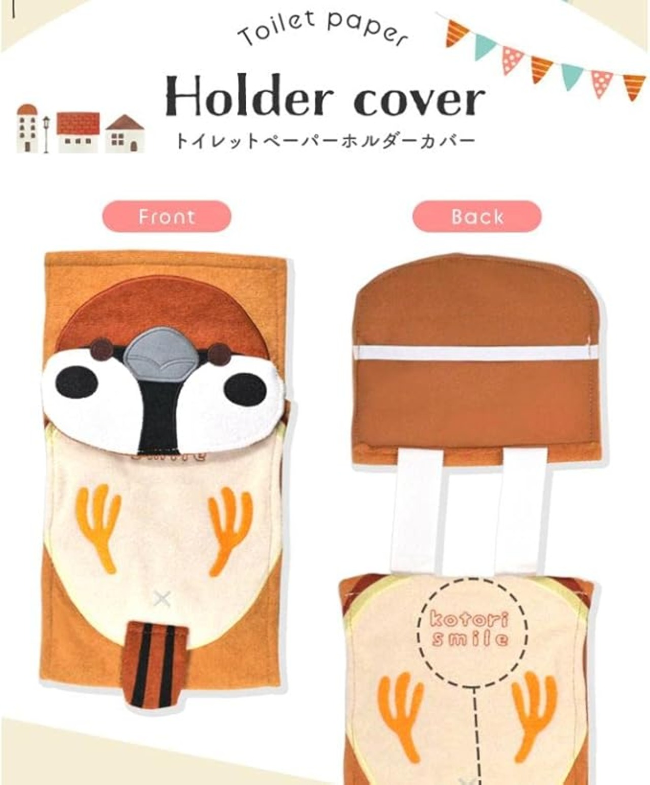 【kotori smile】 ことりカフェ心斎橋オリジナル♪ かわいいトイレットペーパーホルダーカバーができました◎ かわいいディテールは、いつものトイレをよりキュートに演出☆ カンタン取り付けで気軽に模様替えができます。 丈夫な素材でへこたれず、いつまでもかわいいことりちゃんフェイスが魅力的! 優しい手触りのパイル地です。 【サイズ】 フラップ:約15cm 17cm 予備ペーパーホルダー部分:約21cm 17cm 本体全長:縦に約35cm(しっぽ含む) (いずれも平置き時のサイズ) 【商品に関するご注意】 ●包装に使用されている部品(留め具、袋など)は、お子様の手の届かないところに処分してください。 ●金属タイプ、ワンタッチホルダーなどに使用できますが、ホルダー本体とカバー取り付け部のすきまが4mm以上ない場合、取り付けられないことがあります。 ●トイレットペーパーホルダーカバー以外の用途には使用しないでください。