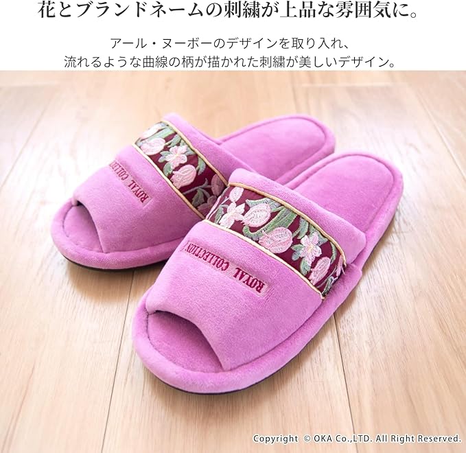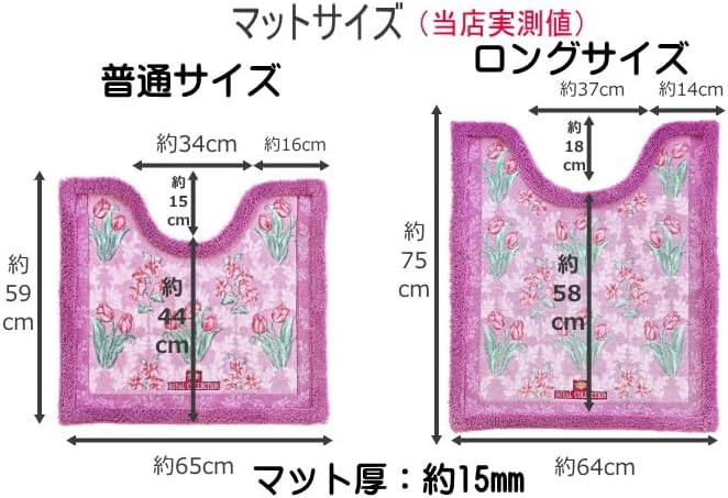 ●北欧おしゃれな人気柄 普通サイズトイレマット、ドレニモふたカバー、ペーパーホルダーカバー、スリッパの4点セットです。 流れるような曲線の柄が特徴的なアール・ヌーボのデザインを取り入れたトイレシリーズです。 フェミニン過ぎず、花柄とオーナメントの地模様がどこかエレガントさを演出。 日本製プリントで、細かい柄の表現と凸凹を出すカービングと美しい発色ができ、上質で価値観のあるトイレマットにしています。 ブランドネームの刺繍と縁周りの長めな毛足のデザインがより高級感のある印象にしてくれます。 裏面にはすべり止め加工付きでズレにくく、洗濯ネットに入れて丸洗い可能なので、衛生的にお使いいただけます。 カラーバリエーションには、エレガントなピンク、植物モチーフを引き立てるグリーン、トレンドカラーのグレーで花の色とベースの色合いがとても美しいです。 ■セット内容 1:普通サイズトイレマット(約58cm 63cm) 2:ドレニモ型ふたカバー (約42 40cm) 3:スリッパ 4:ペーパーホルダーカバー 商品詳細 1:普通サイズトイレマット 素材:アクリル100%(裏面滑り止め加工) / 生産国:日本 / 重量:485グラム / 首下 約42cm 本体サイズ:約58cm 63cm 1.5cm 2:ふたカバー(ドレニモ型) 素材:アクリル100%、吸着シート アクリル樹脂 / 生産国:日本 / 重量:200グラム 本体サイズ:約42 40 2cm 対応フタタイプ:普通型、洗浄・暖房型共通 3:ペーパーホルダーカバー 素材:綿75%・ポリエステル25%、成形部品 ポリプロピレン / 生産国:中国 / 重量:60グラム 本体サイズ:約34 17 2cm ※成型部品がペーパーホルダーの隙間(※厚さ4mm以上、幅113mm以上)に差し込める場合は装着可 4:スリッパ 素材:綿75%・ポリエステル25% / 生産国:中国 / 重量:175グラム 本体サイズ:約28 22.5 8cm ※足のサイズ約25cmまで