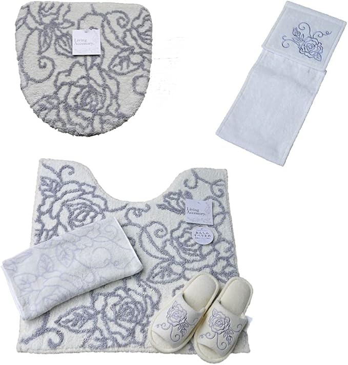【ホワイト】トイレマット 洗浄暖房用 普通便座兼用フタカバー 含む 5点セット クリアローズ エレガントなローズ模様 薔薇 ローズ