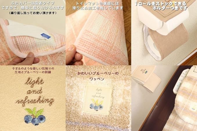 ●洗浄暖房型・普通型共用ふたカバー、普通サイズトイレマット、ペーパーホルダーカバー、スリッパの4点セット。    ●洗浄暖房便座でも、普通便座(洗浄便座がついていない便座)でも共用で使用できる吸着タイプです。    ●マットの裏側には滑り止め加工がしてあります。    ●フランス語で「新鮮な」を意味するフライス (frais)      ●現代のライフスタイルを意織したナチコラルテイストのトイレシリーズてす。    ●人と繋がリ自然に寄り添うことをイメ ージし、ホッと落ち菩ける暖かみのあるデザインです。   ●「ギンガムチェック」と「フルーツ」が、暖かさを表現しています。     ■セット内容  1:共用ふたカバー  2:普通サイズトイレマット(約60cm 55cm)  3:スリッパ  4:ペーパーホルダーカバー   ●カラー:ベージュ (ブルーベリー)      ●商品詳細 1:普通サイズトイレマット サイズ:約60cm 55cm 素材:アクリル100% 裏面すべり止め加工(首下41cm) 生産国:中国製    2:共用ふたカバー ドレニモタイプ(共用タイプ) ●装着可能サイズ:フタの厚み+長さが47~52cmまで装着可能 ●自動開閉機能付きのトイレには適合しません。 素材:アクリル100% 吸着シート:アクリル樹脂 お洗濯の際は洗濯用ネットをご使用ください 。 薬品を使ってお掃除する場合はフタカバーを外してください。 生産国:中国製    3:スリッパ 足のサイズ:約25cmまで 素材:綿75% ポリエステル25% 生産国:中国製 洗濯機での丸洗いは洗濯ネットをご使用ください。 家庭用洗剤をご使用ください。 乾燥機はご使用にならないでください。     4:ホルダーカバー 素材:綿75% ポリエステル25% 成型部品 ポリプロピレン 生産国:中国 装着可:成型部品がペーパーホルダーの隙間(※厚さ4mm以上、幅113mm以上)に差し込める場合 ※お洗濯の際は洗濯用ネットをご使用ください ※お洗濯の時は成形部品を必ず外してください ホルダー下部には予備のトイレットペーパーを1ロールストックできます。 乾燥機はご使用にならないでください。