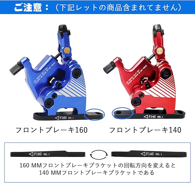 利点:フロントアダプター F140/F160共用,160mmフロントブレーキブラケットは、回転させることにより140mmフロントブレーキブラケットに変更可能です。