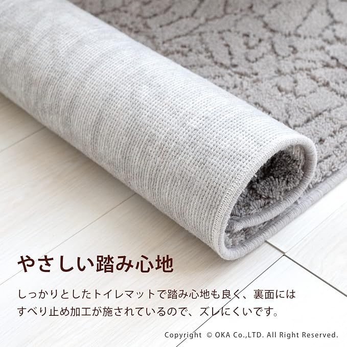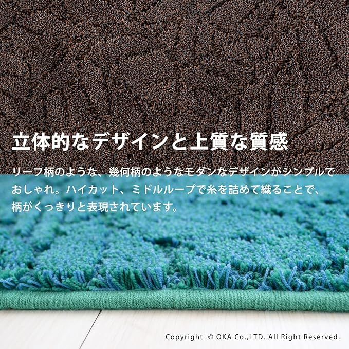 トイレの空間をクリーンに、手軽におしゃれにトイレを清潔感ある印象にしてくれるトイレマット。糸には、東レの消臭繊維「アデリカ」を使用しています。繊維そのものに消臭効果があるので、お洗濯や日光にあてることで消臭機能は回復します。リーフ柄のような幾何柄のようなモダンなデザインと糸を詰めて織り、柄をくっきり出すことで上質でしっかりとした仕上がりになっています。一枚のマットに2色の糸を使って織っており、グリーン ブルー、グレー グレイッシュピンク、ブラウン チャコールグレーの組み合わせがリッチで奥行き感のある雰囲気にしてくれます。トイレマットはを敷くことで、床への水はねを吸水し、床の汚れを目立たなくします。また、ダストボックス効果でハウスダストやホコリが舞いにくくなります。※ダストボックス効果 カーペットやマットには繊維に付着したハウスダストやホコリを糸部分で取り込む効果。