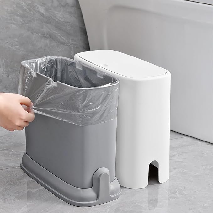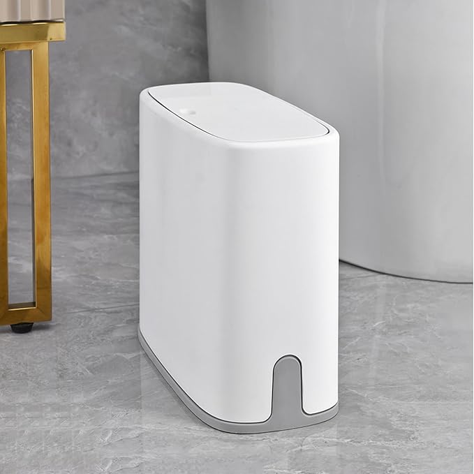 【スリムでコンパクト】横幅わずか14cmのスリムサイズで隙間にスッキリ収納できます。トイレやバスルームなど、狭い場所にフィットします。蓋付きなので、風呂場に置いても水が入りません。キッチンゴミ箱高さ:27.5 cm、幅:14 cm、長さ:32 cm。