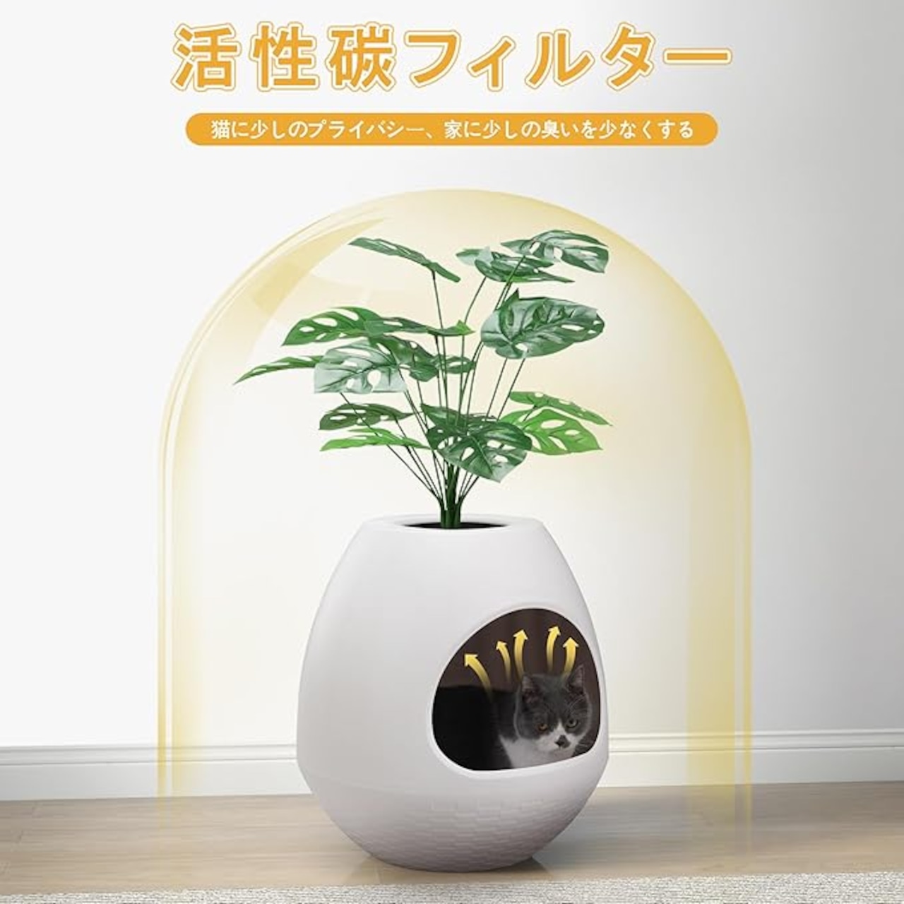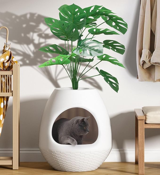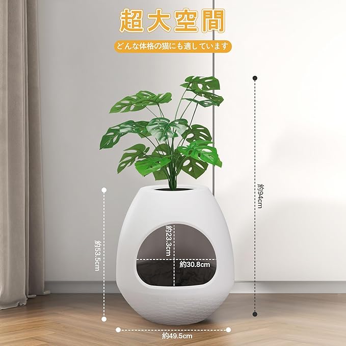 猫の排泄に最適な助け手として、猫のトイレはあなたの家を清潔で不快な匂いから解放します。軽量でデザイン性の高い外観なので、リビングルーム、寝室、バルコニーに自由に設置できます。付いてきた人工モンステラ・デリコサは、あなたの家に新鮮な雰囲気を加えます。さらに、このトイレは猫たちに安全な感触を与え、隠れるかリラックスすることができます。猫のトイレ用スクープとマットは、ペットの排泄物を簡単に掃除するのに役立ちます。愛猫にこの素晴らしいトイレを手に入れましょう!特徴: