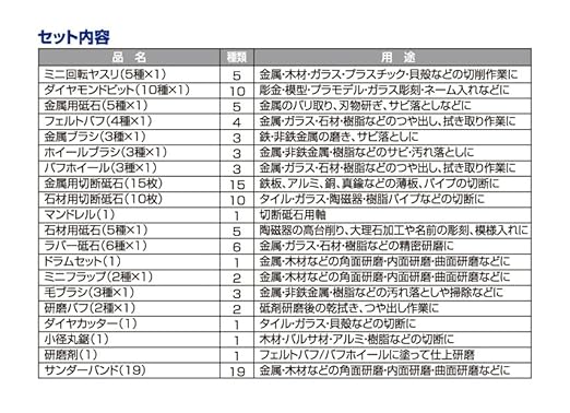 <セット内容>:100本組セット:ミニ回転ヤスリ(5種、各1本)、ダイヤモンドビット(10種、各1本)、金属用砥石(5種、各1本)、フェルトバフ(4種各1本)、金属ブラシ(3種、各1本)、ホイールブラシ(3種、各1本)、バフホイール(3種、各1本)、金属用切断砥石(15種、各1本)、^石材用切断砥石(10種各1本)、マンドレル(1種各1本)、石材用砥石(5種各1本)、ラバー砥石(6種各1本)、ドラムセット(1種)、ミニフラップ(2種各1本)、毛ブラシ(3種各1本)、磨バフ(2種各1本)、ダイヤカッター(1種)、小径丸鋸(1種)研磨剤(1種)、サンダーバンド(19種各1本)^軸径:2.35mm^ケースサイズ:215 155 65mm^重量:591g^削る、切る、彫る,磨くなどのベーシックな作業にあれこれ使える先端工具を100点厳選しました。^金属、非鉄金属、石材、ガラス、タイル、木材、貝、プラスチック等の研磨、精密研磨、サビ落とし、ツヤ出し、穴あけ、切削、切断にご使用ください。^収納と持ち運びに便利なハードケース入り。^無理な使用は危険です。安全で効率よく作業する為に、加工素材の材質をよく確かめてください。指定された用途以外には使用しないで下さい。