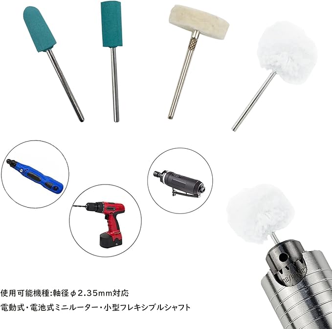 【高品質線材】:ミニルーター用先端パーツ 素材:純毛(フェルト),コットン,硬質ゴム 耐久性と実用 小さな、良好な研磨効果、高効率、低コスト 梱包:コットンバフ5本&フェルトバフホイール型5本&ゴム砥石円筒型5本,砲弾型5本    コレットチャック径:直径約2.35mm