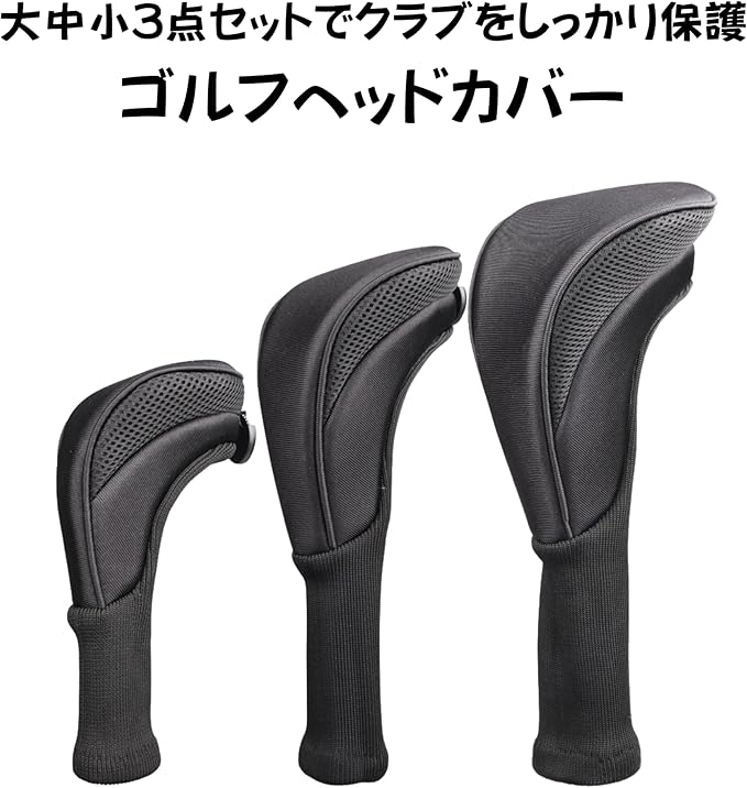 ゴルフクラブをしっかり守る、大中小3点セットのヘッドカバーです。ドライバー、フェアウェイウッド、ユーティリティに対応しており、ラウンドや練習場で大切なクラブをキズや衝撃から保護します。
