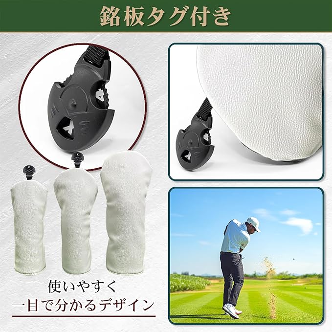 高品質で柔らかなPVCレザー素材を使用。 高級感のあるデザインと滑らかな手触りを実現。 バリエーション:ドライバー単品、フェアウェイウッド単品、 ユーティリティー単品 フルセット(ドライバー1個・フェアウェイウッド2個・ユーティリティー1個の4個セット) 各種に色のバリエーションがあります:白レザー調・黒レザー調・カーボン調