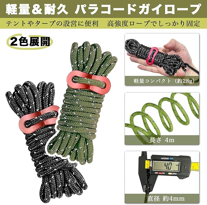 【多用途】キャンプ、テント設営、タープ設営、天幕使用、アウトドア活動に最適です。反射材が安全を確保し、さまざまなシーンで活躍します。に注意:登山用のロープではありませんので、登山には使わないでください。