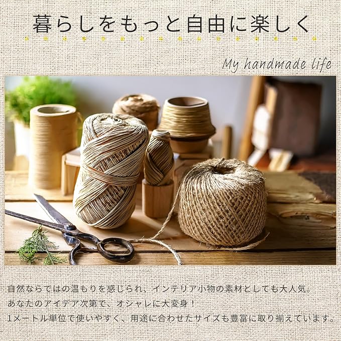 【丈夫でナチュラル。選べる太さと長さで使い方自由自在】 しっかりとした作りで耐久性も抜群。10mm、16mm、26mmと用途に応じた3種類の太さを用意しております。必要な分だけカットして使えるので無駄がなく、環境にも優しいアイテムです。 麻縄特有の素朴な香りと風合いがあり、見た目にも温かみがあります。人工素材にはない味わい深さと安心感があり、DIY愛好家からナチュラル志向の方まで幅広く支持されています。