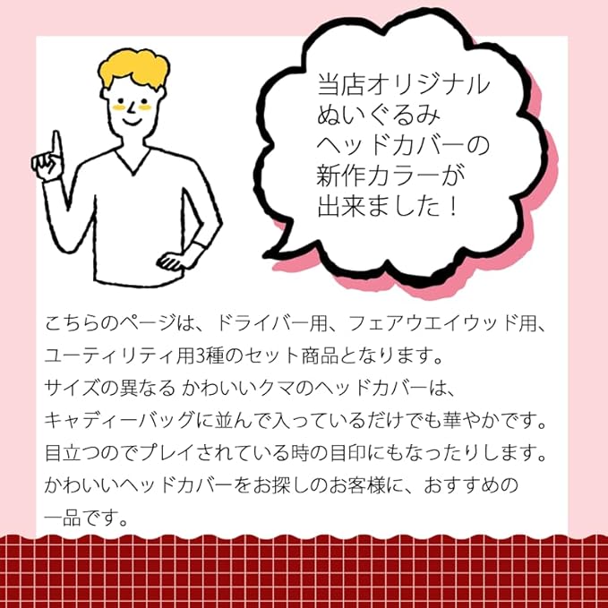 人気商品だったルーズベルトテディベアのぬいぐるみヘッドカバーセットに新色登場! ドライバー、フェアウェイウッド、ユーティリティカバーの3種類が全てカラフルな可愛いぬいぐるみになっています。 思わず笑顔がこぼれてしまう愛らしさ。 フードからひょっこり顔を出す姿はもう、たまりません。 可愛さ重視のRTBからの新商品は、可愛いあの子への プレゼントにも最適な一品となっております☆ ぬいぐるみタイプヘッドカバー
