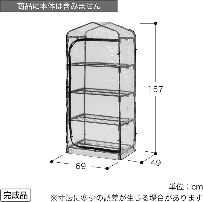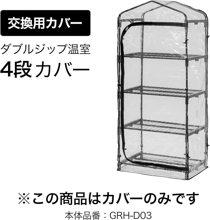 寒さや霧から大切な植物を守る、開閉しやすく使いやすいダブルジップ温室4段(GRH-D03)専用カバー。ダブルジップだからお好みの場所で部分的に開閉が可能。横開閉だから、植物の出し入れがしやすい。※こちらの商品はカバーのみとなります。商品に本体は含みません。