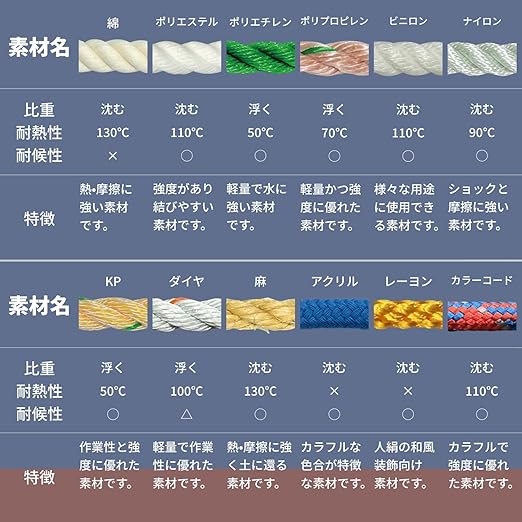 【軽量・強力】ポリエチレンロープは軽量で水に強く、ショックにも強いロープです。またロープ表面は硬くて滑りやすいという特徴があります。